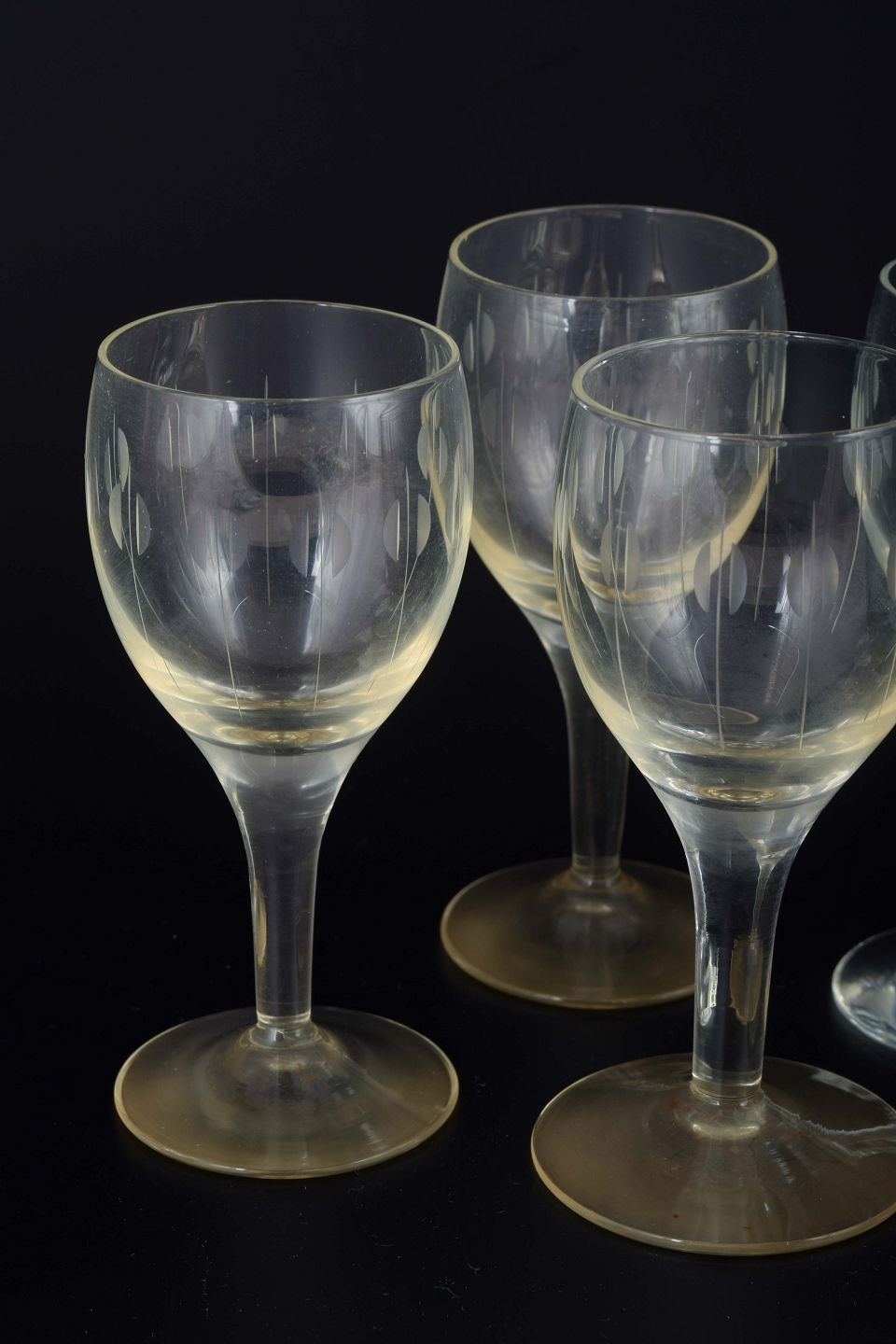 Mundblæste glas med kort stilk og høj, slank bowle. Dekoreret med indgraveret mønster i form af lodrette linjer med ovale elementer.