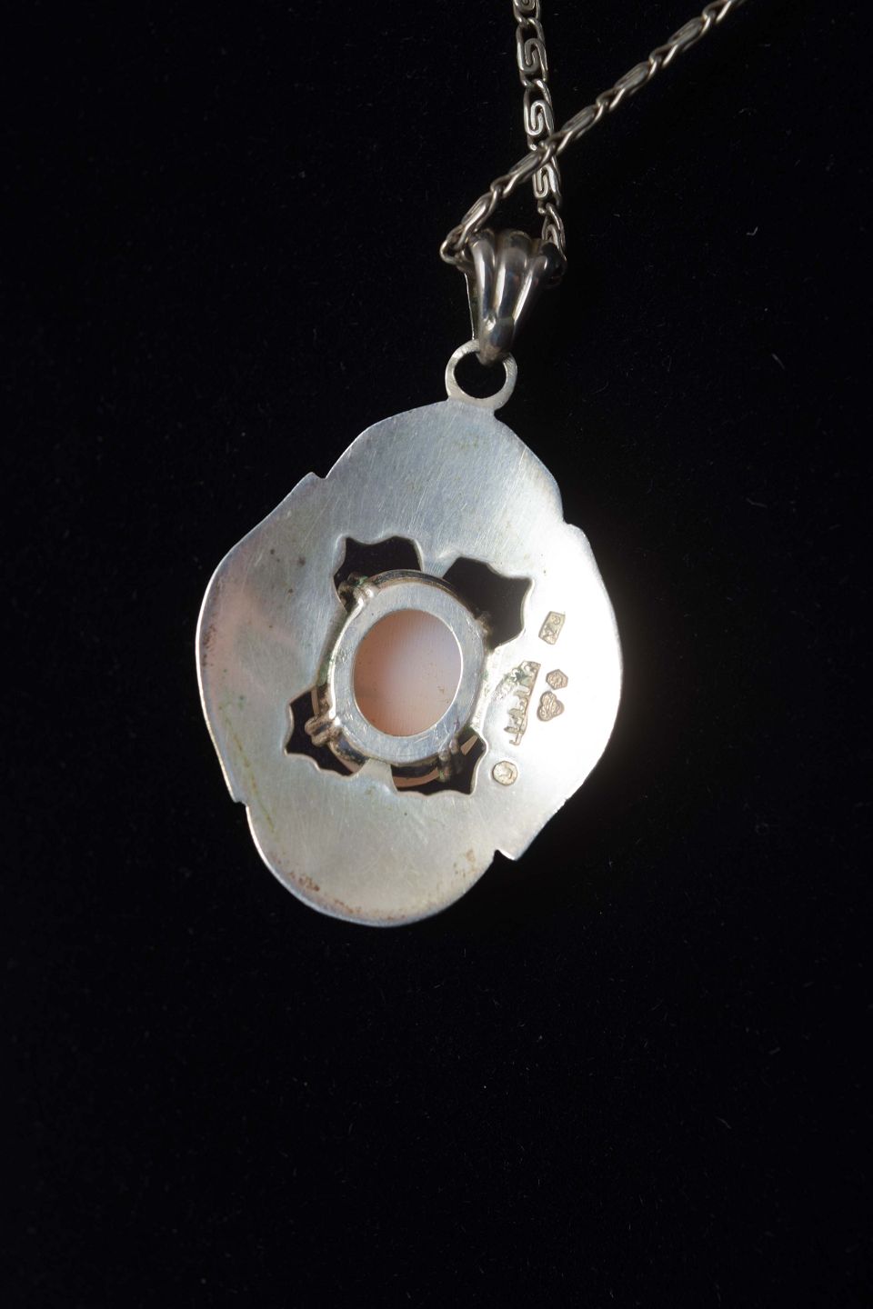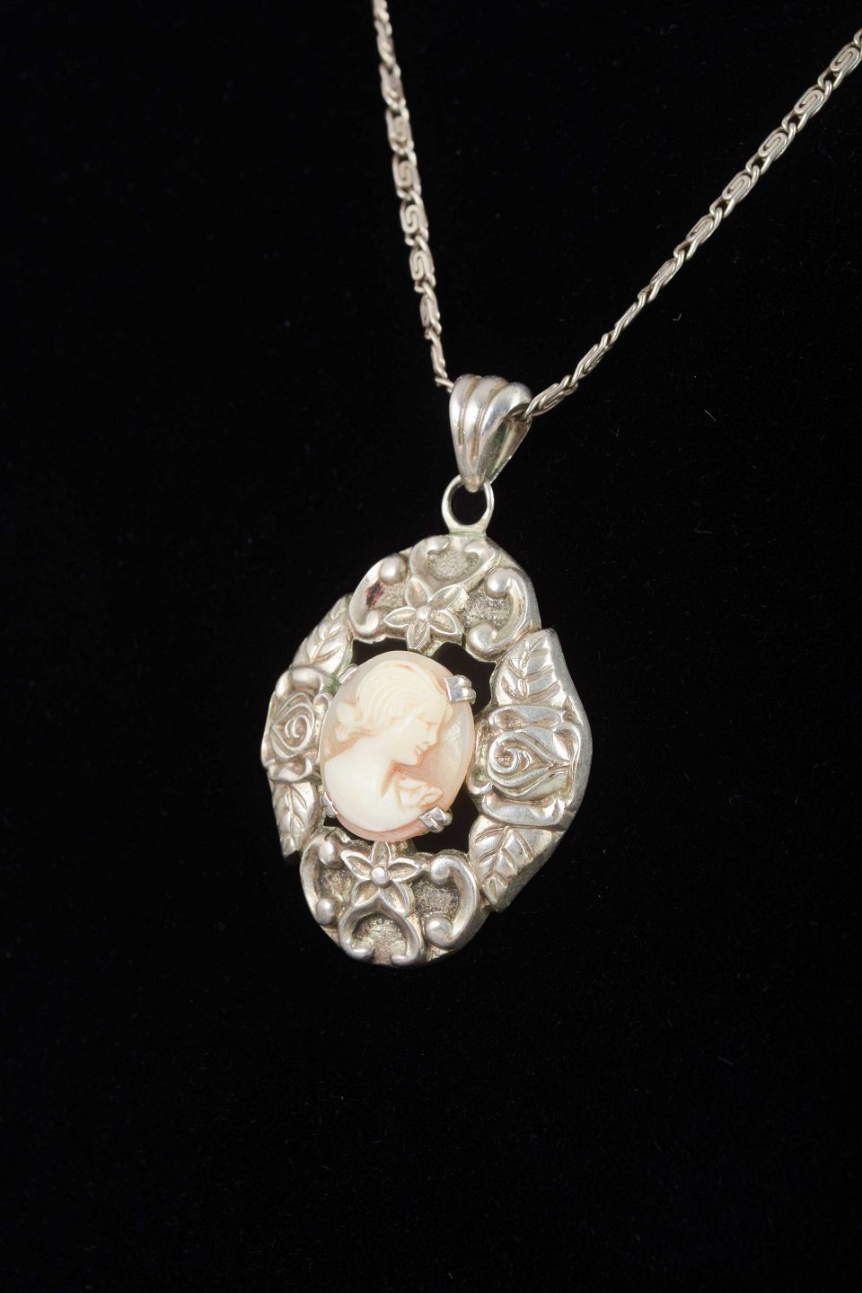 Sølvhalskæde med vedhæng, smukt udført med en klassisk cameo og blomsterornamentik.