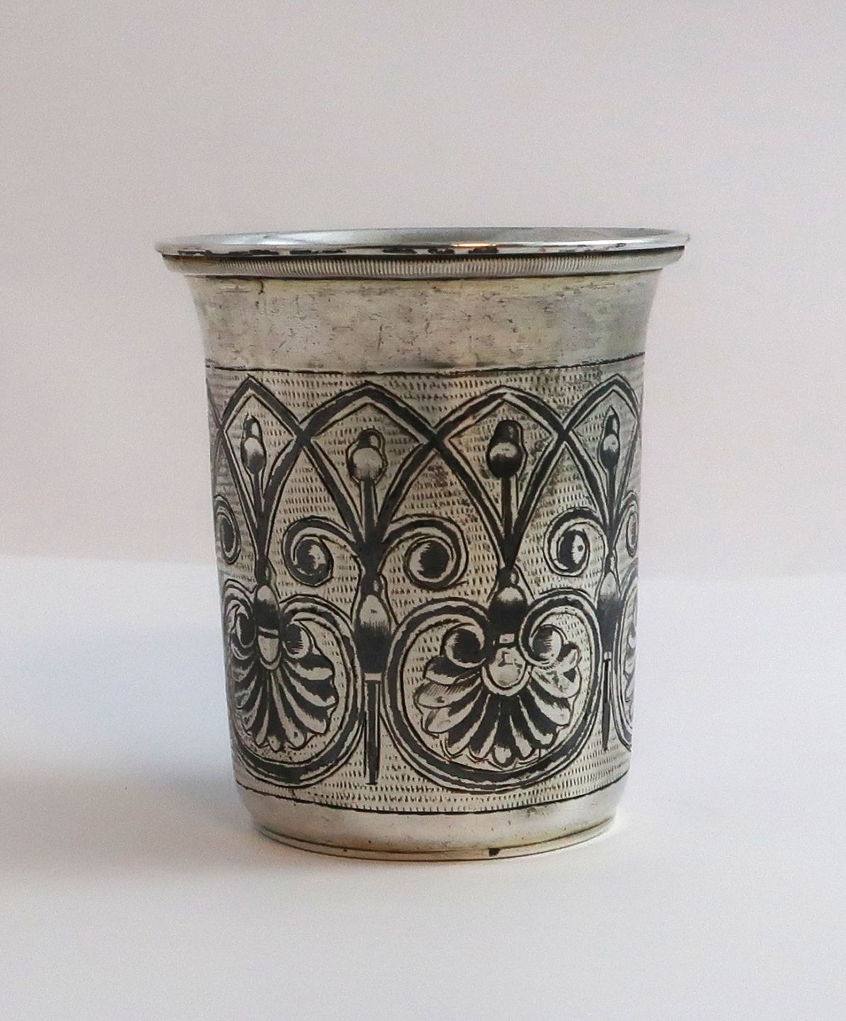 Russland. Kleiner Silberbecher mit Niello (84). Höhe 6 cm. Durchmesser 5,1 cm. Hergestellt 1837