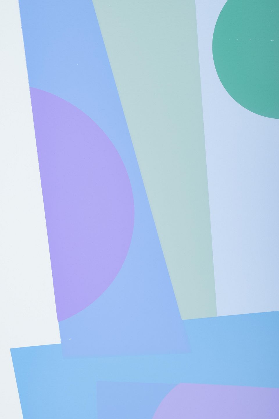 Et geometrisk-abstrakt værk i blå og violette farvetoner, brudt af grønne og lilla cirkelformer. Kompositionen er karakteriseret ved klare farveflader og præcist afbalancerede former, der fremhæver Kragh-Jacobsens konstruktive billedsprog, hvor farve og form spiller den afgørende rolle.