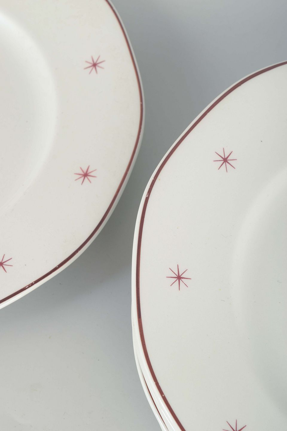 Art Deco-inspirerede tallerkener i hvidt porcelæn med dekoration i brune og gyldne toner, stjerneornamenter langs randen samt motiv af et hus og træer.