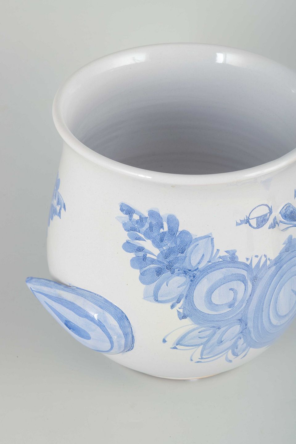 Organisk formet urtepotte-skjuler i hvidglaseret fajance med håndmalet blå spiral- og blomstermotiv.