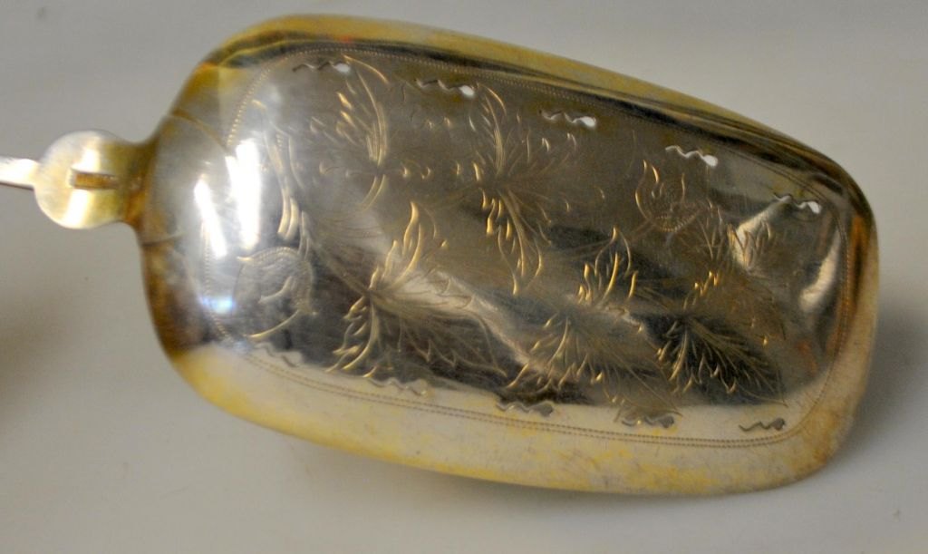 Dänischer Erdbeerlöffel mit Meisterstempel, 19. Jahrhundert. Vergoldet und mit Erdbeeren graviert. Glatter Griff. Unklarer Meisterstempel. L 28 cm.