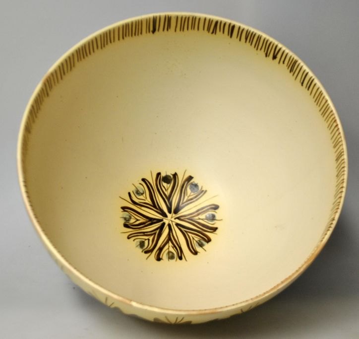 Krøyer, Ady (1933 - 2016) Dänemark: Keramische Tischschale. Roter Ton mit gelber, grüner und brauner Glasur. Außen mit einem Blattmuster verziert. Auf der Unterseite - vermutlich ein Samendekor. Innenseiten mit einem Linienmuster verziert. Signiert: Ady, Dänemark. H.: 16 cm. Durchmesser: 24,5 cm.