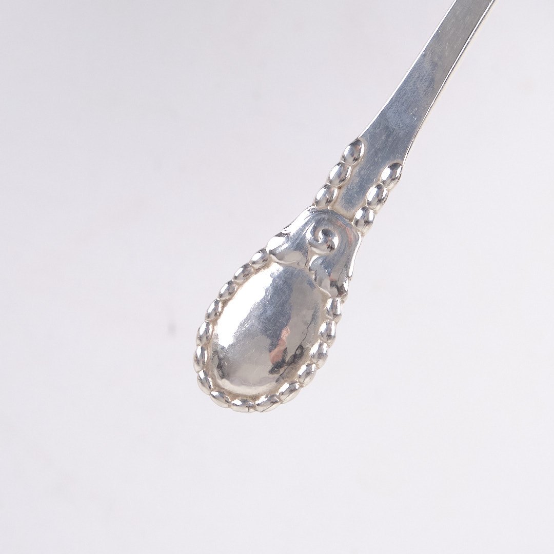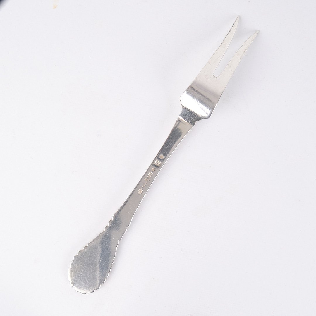 Text zugänglich auf Dänische: Stegegaffel i mønster nr. 13 af Evald Nielsen. Tretårnet sølv, stemplet. Klassisk dansk sølvdesign i tidløs kvalitet.