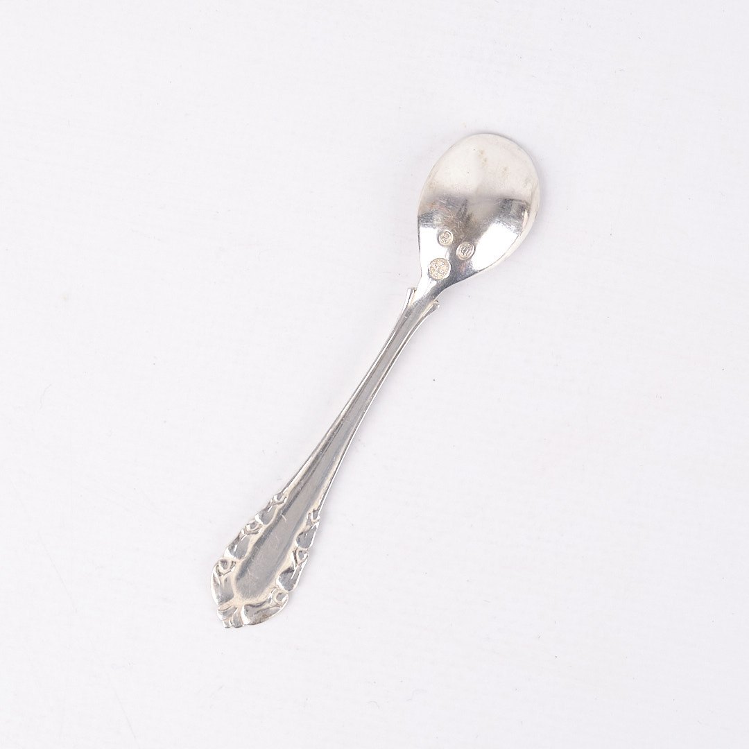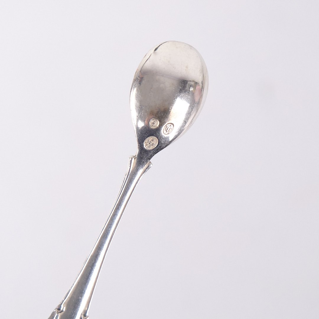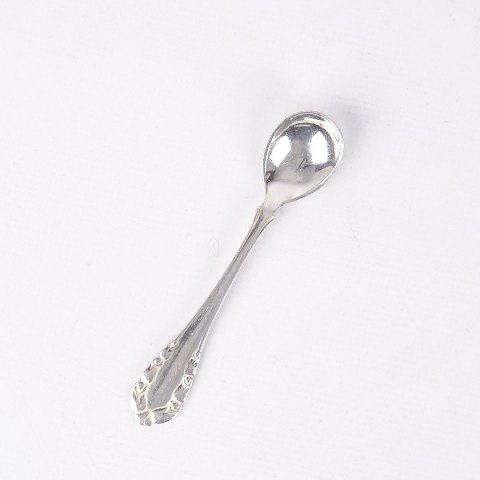 Text zugänglich auf Dänische: Saltske i sølv fra Georg Jensen, udført i det elegante Liljekonval (Lily of the Valley) mønster. Skeen er stemplet og udformet med bløde linjer og naturlige blomsterdetaljer, der kendetegner Georg Jensens organiske designstil.