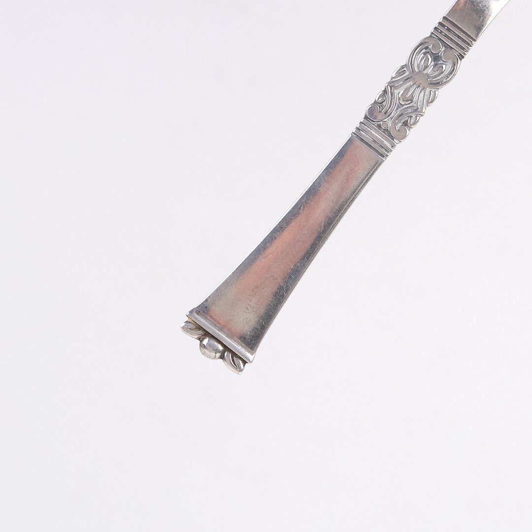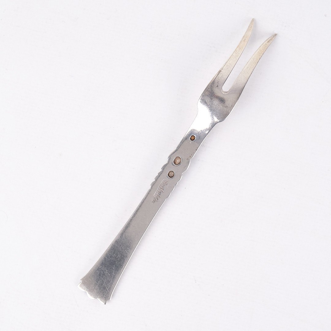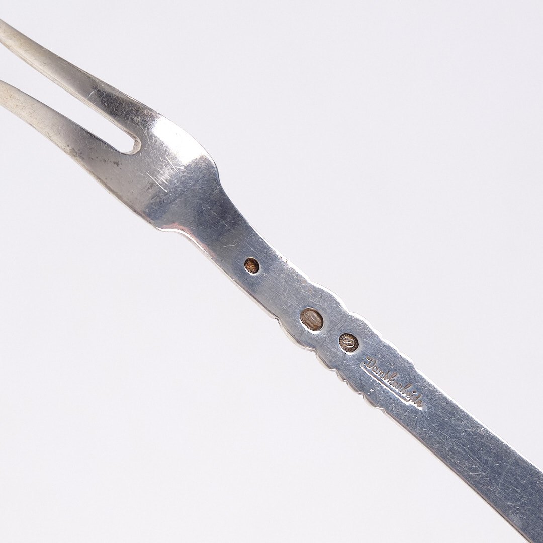 Text zugänglich auf Dänische: Pålægsgaffel i Rigsmønstret design af Poul Frigast. Sølv 830s fra 1930’erne.