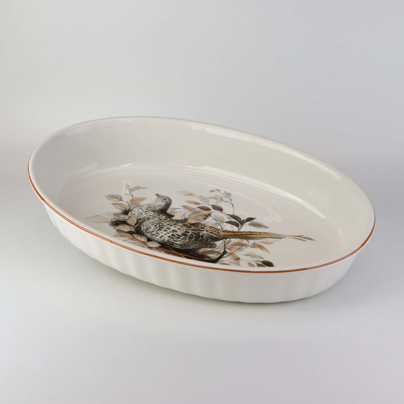 Text zugänglich auf Dänische: Ovalt ildfast fad i porcelæn med motiv af agerhøne på rede fra stellet Jagtstel. Nr. 2