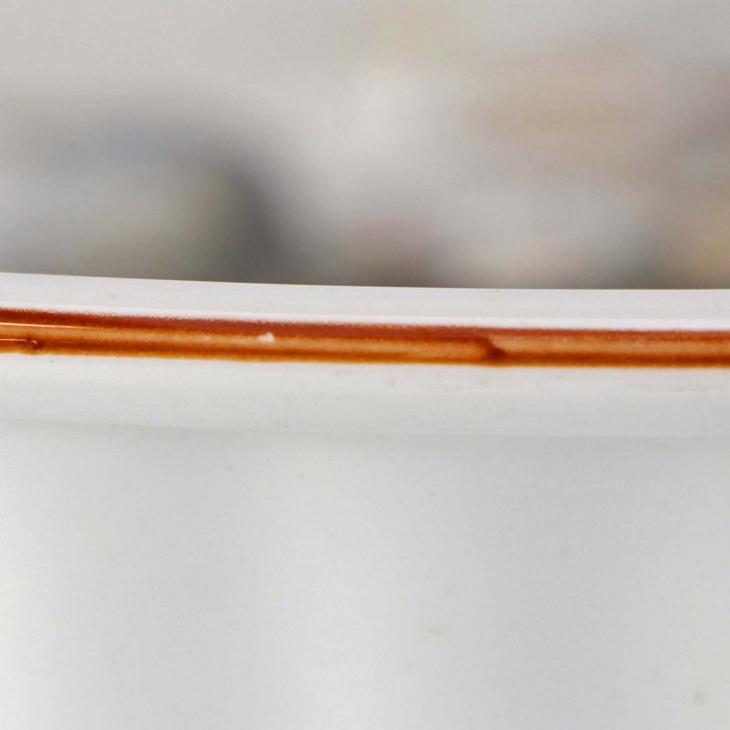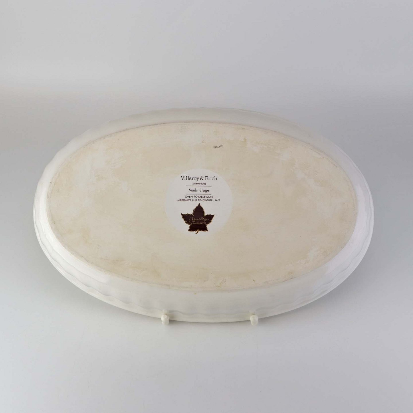 Fremstår med med mindre brugsspor på topkanten og yderside samt overfladiske ridser i fadets bund.