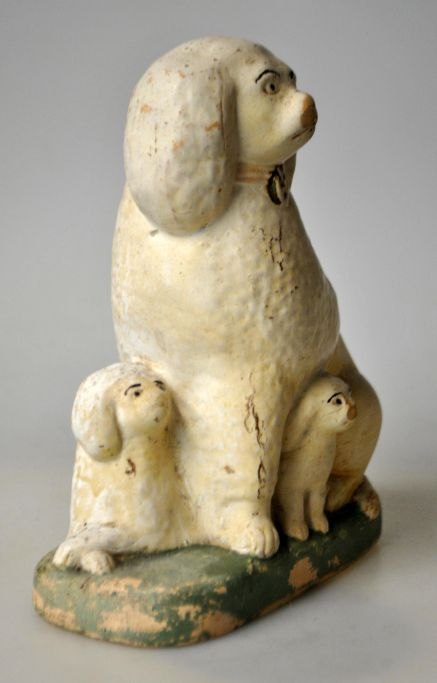 Spardose aus kalt bemaltem Ton, 19. Jahrhundert. Bornholm. Dänemark. Spardose in Form eines Pudels mit zwei Welpen. H.: 18 cm.