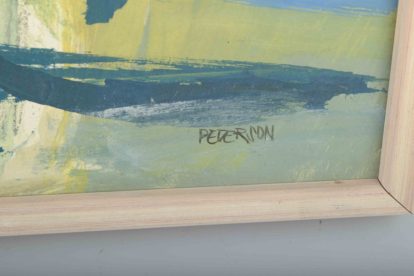 Et stemningsfuldt abstrakt stilleben, hvor geometriske og bløde former i blå, grønne og gule nuancer skaber en harmonisk og lyrisk komposition. Motivet antyder et interiør med blomster og genstande, fortolket i en løs og ekspressiv penselføring typisk for perioden.