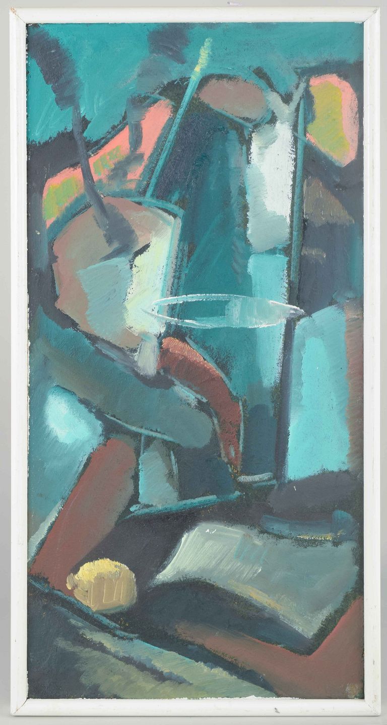 Et modernistisk maleri, hvor genkendelige elementer som et glas og en bog synes antydet midt i den geometriske og organiske abstraktion. De turkise, blå og røde farveflader skaber en rytmisk bevægelse, der giver værket både dybde og stoflighed.