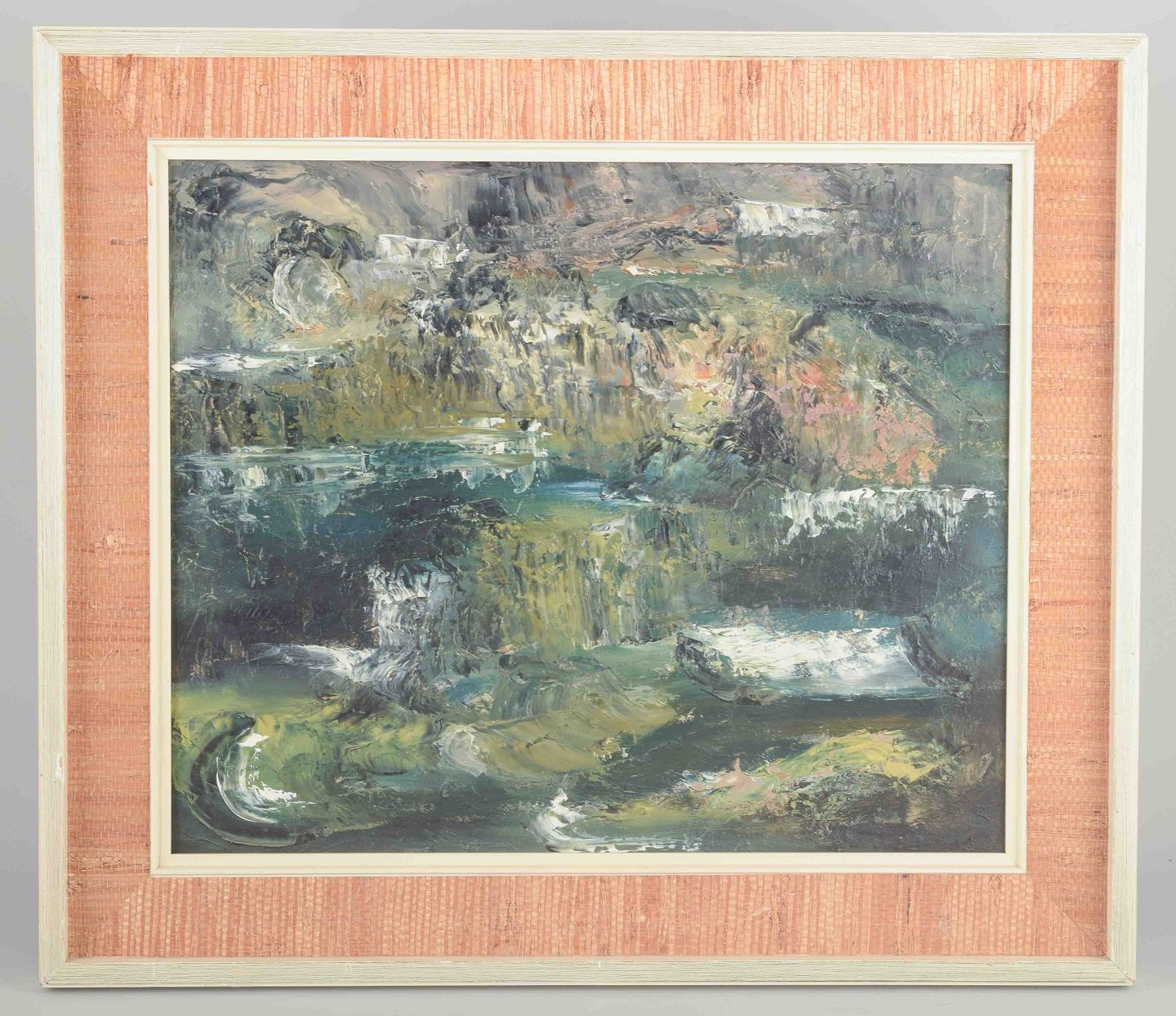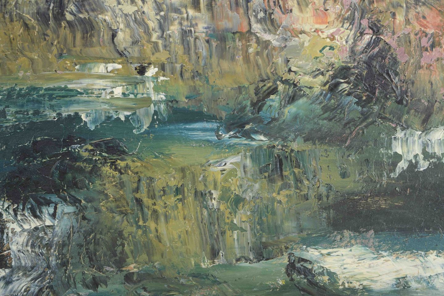 Et ekspressivt abstrakt maleri med kraftfulde penselstrøg og dybe grønne, blå og jordagtige toner, hvor strukturen i farvelagene skaber en levende og dramatisk overflade.