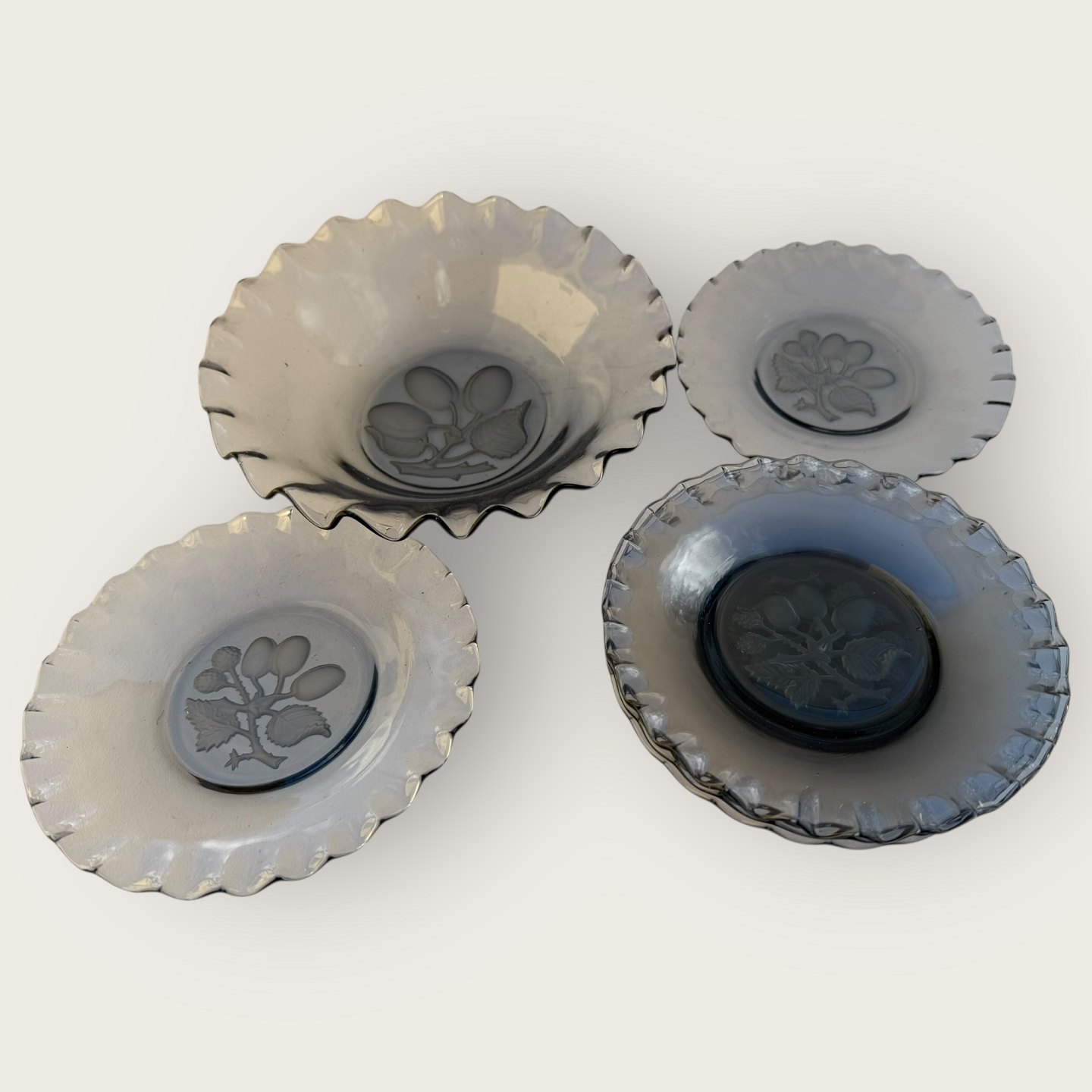 Glasschale und 6 Dessertteller mit Blumen-/Obstmotiv, gerüschter Rand aus grau getöntem Glas, Schalendurchmesser 21cm, Höhe 5,5cm, Tellerdurchmesser 16,5cm, *guter Zustand*
