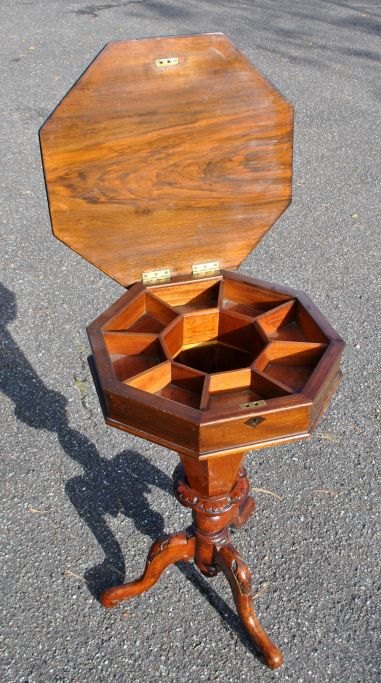 8-seitiger Nähtisch aus Walnussholz mit Intarsien, 19. Jahrhundert. Dänemark. Auf geschnitztem Dreibein. 8-seitige Säule zur Garnaufbewahrung. 8-seitige Platte mit Tischplatte. Innen mit 8 Fächern. Mit Schlüssel und Schloss. Platte mit Intarsien in Sternmuster verziert. Poliert. H.: 72 cm. Durchmesser Platte: 42 cm.