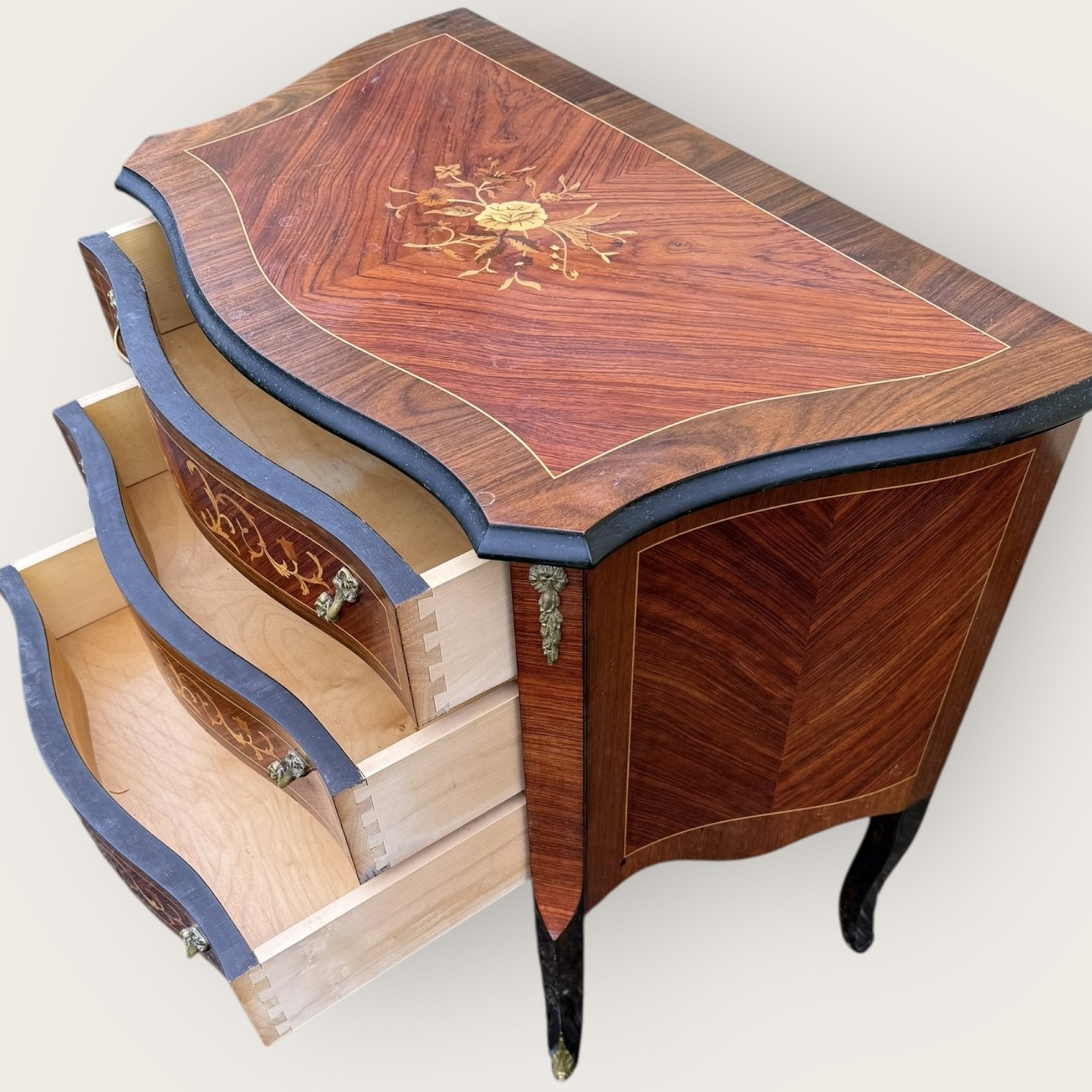 Kommode mit Intarsien, 3 Schubladen, einige Gebrauchsspuren, Maße: HxBxT 68x70x39cm