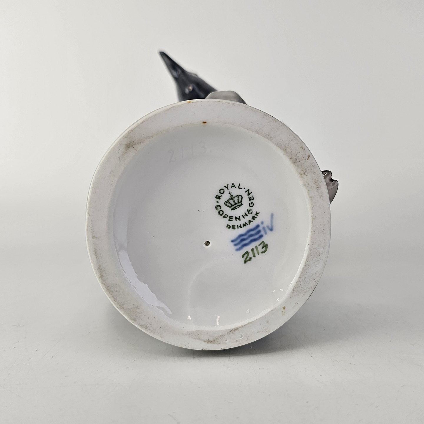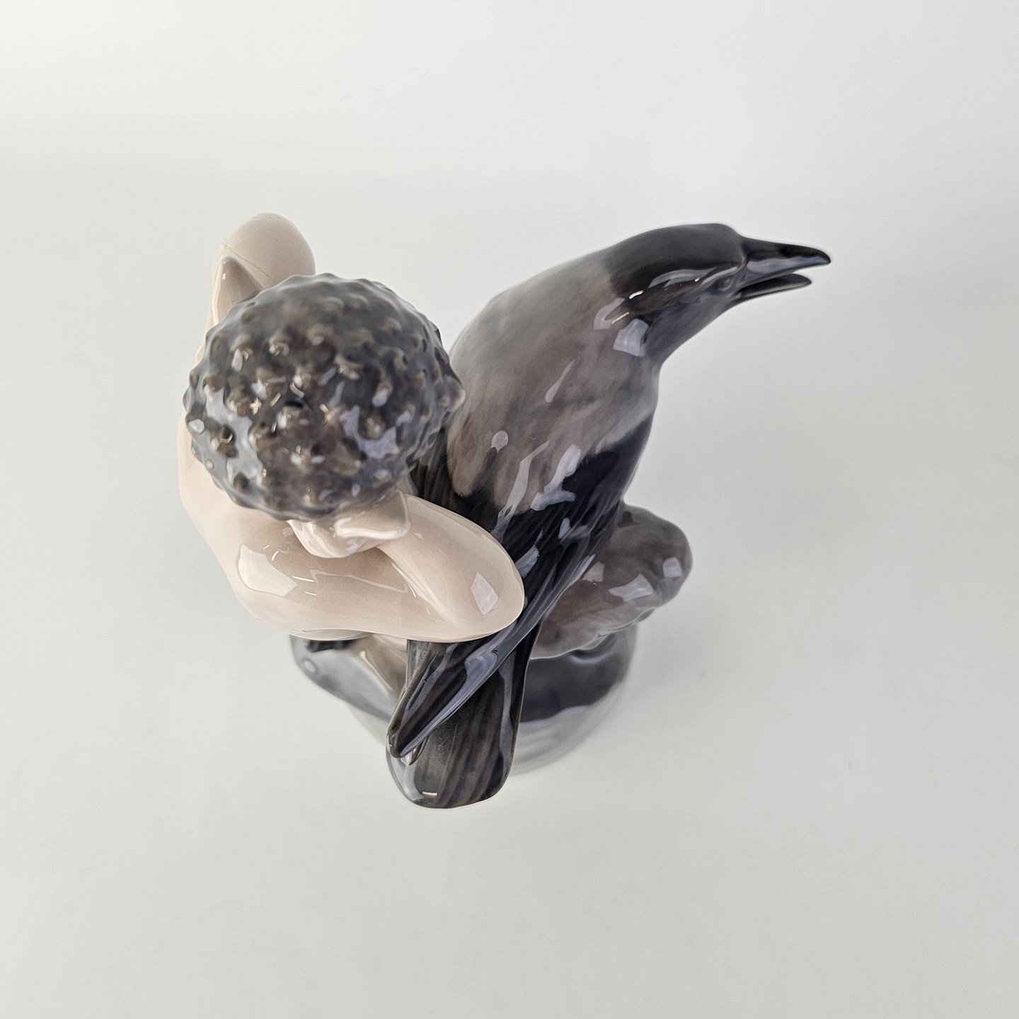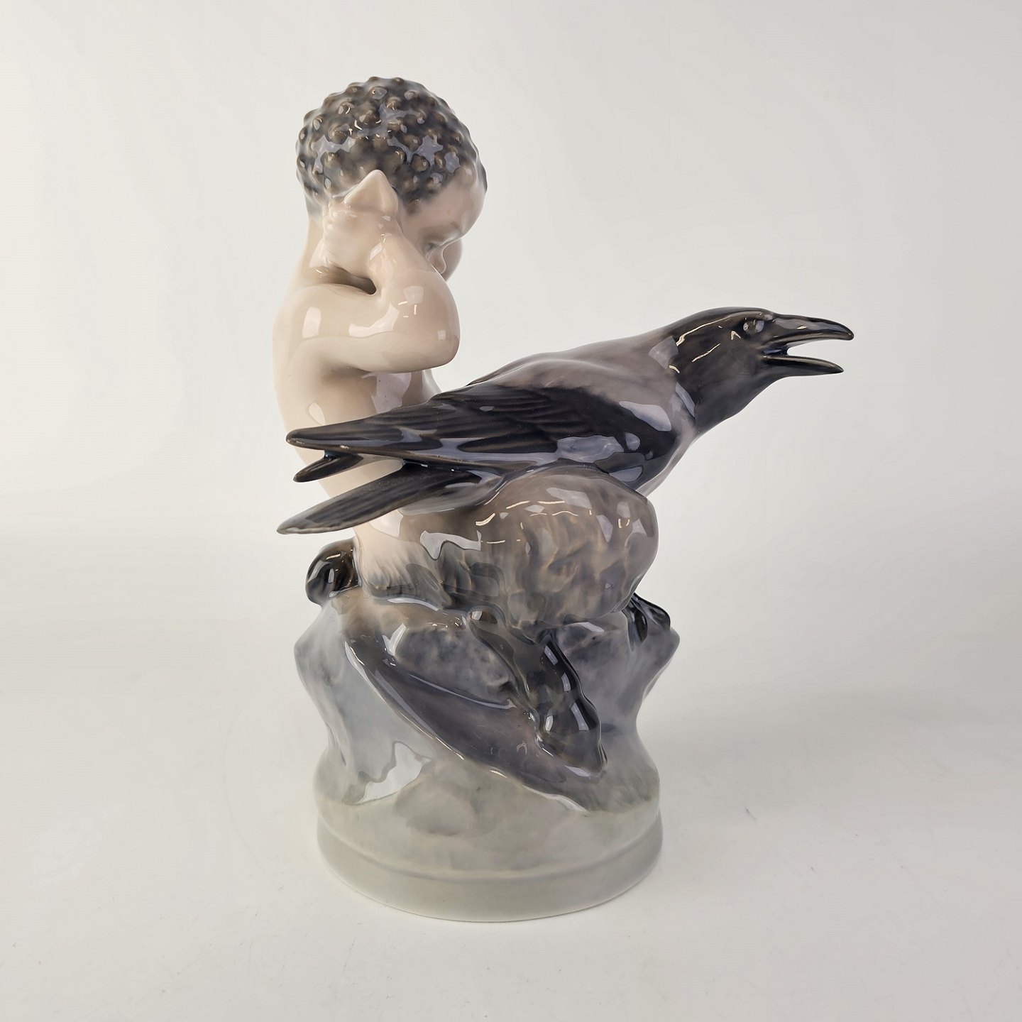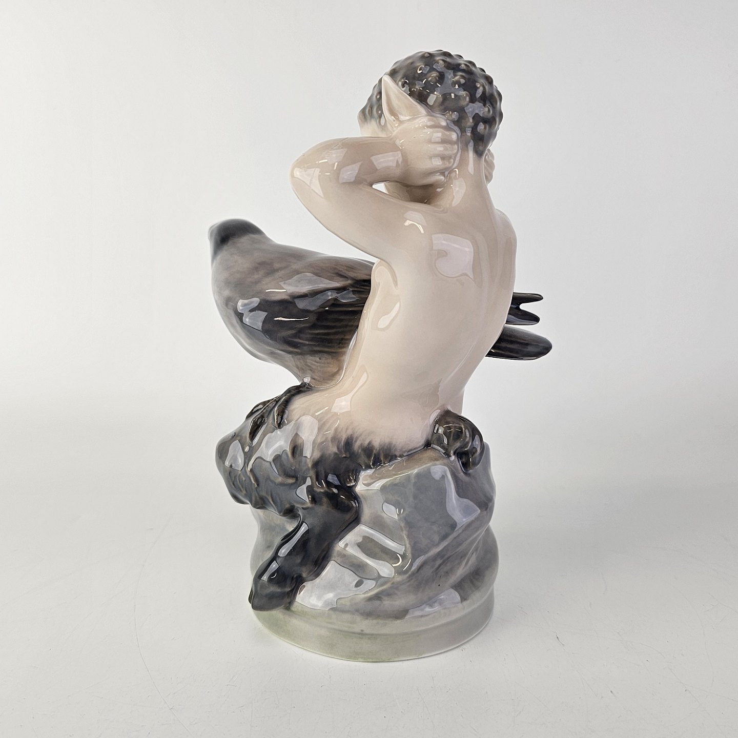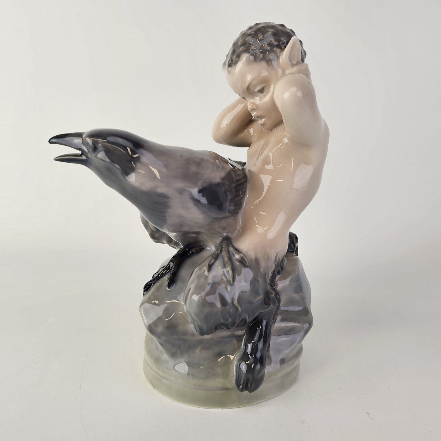 Text zugänglich auf Dänische: Figur af porcelæn med motiv af en faun som holder sig for ørerne med en krage i skødet