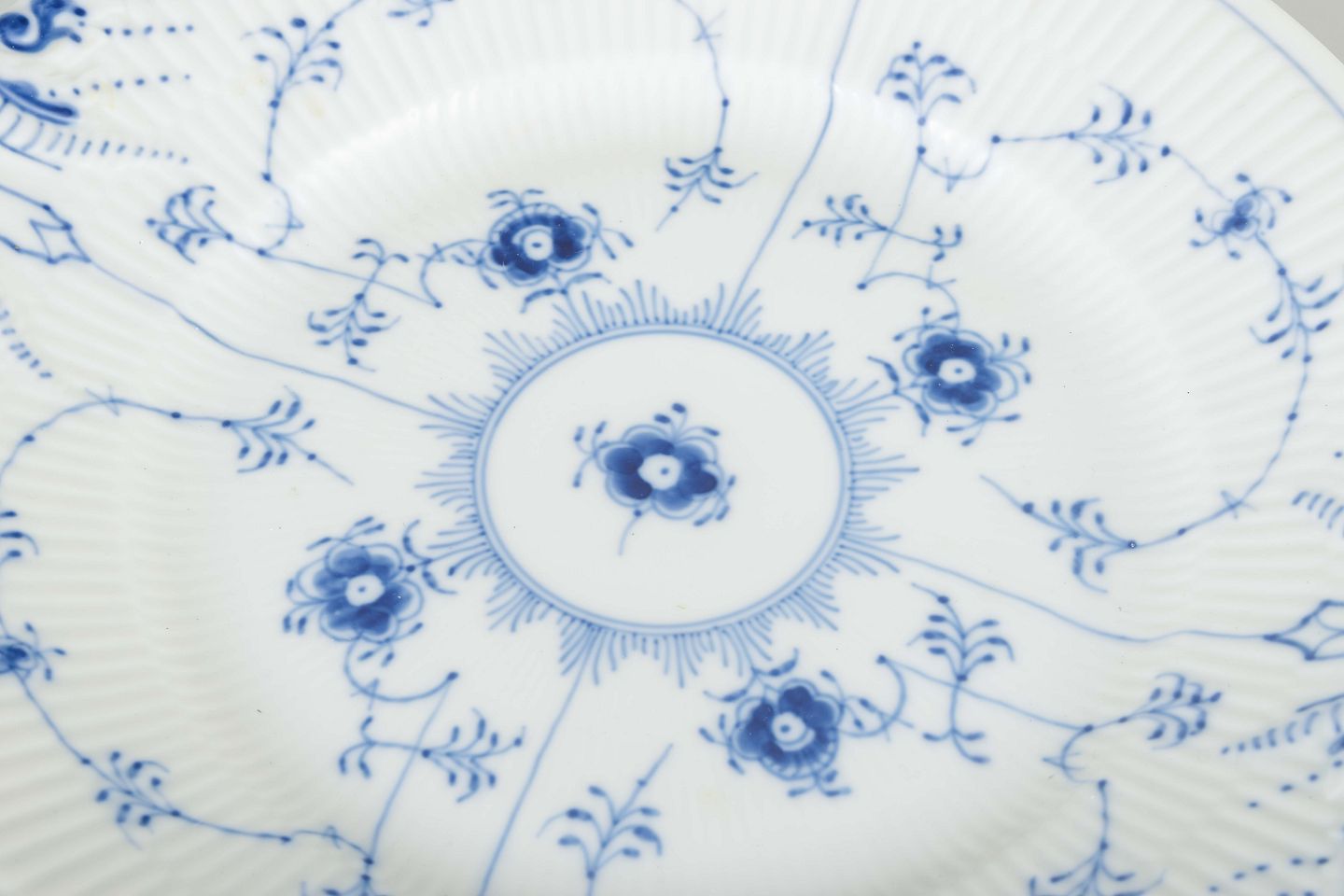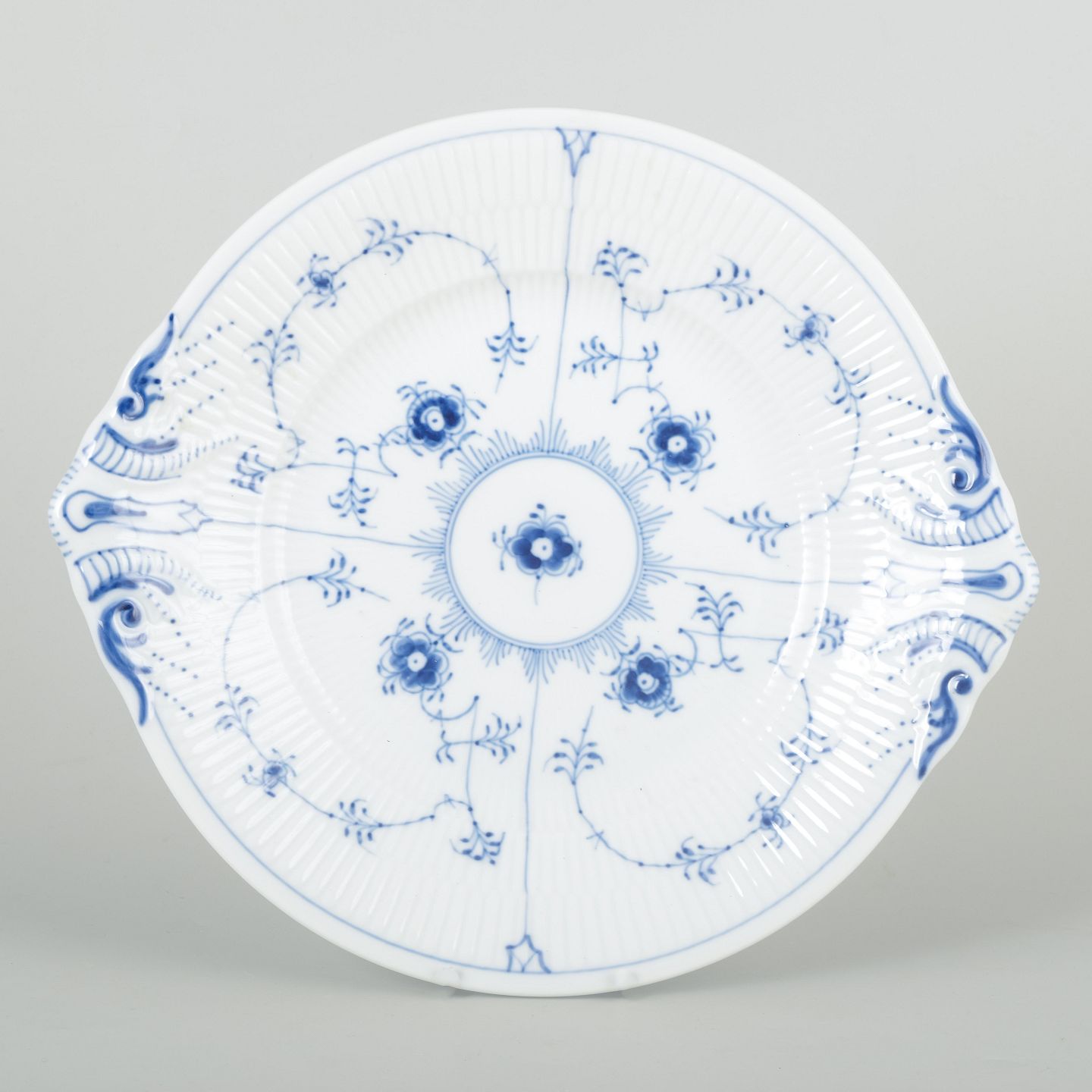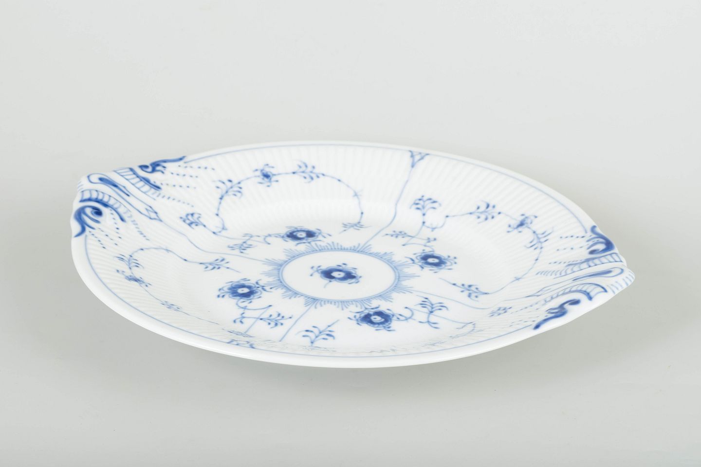 Stort rundt fad i porcelæn med hanker, dekoreret i musselmalet riflet mønster i blå underglasur.