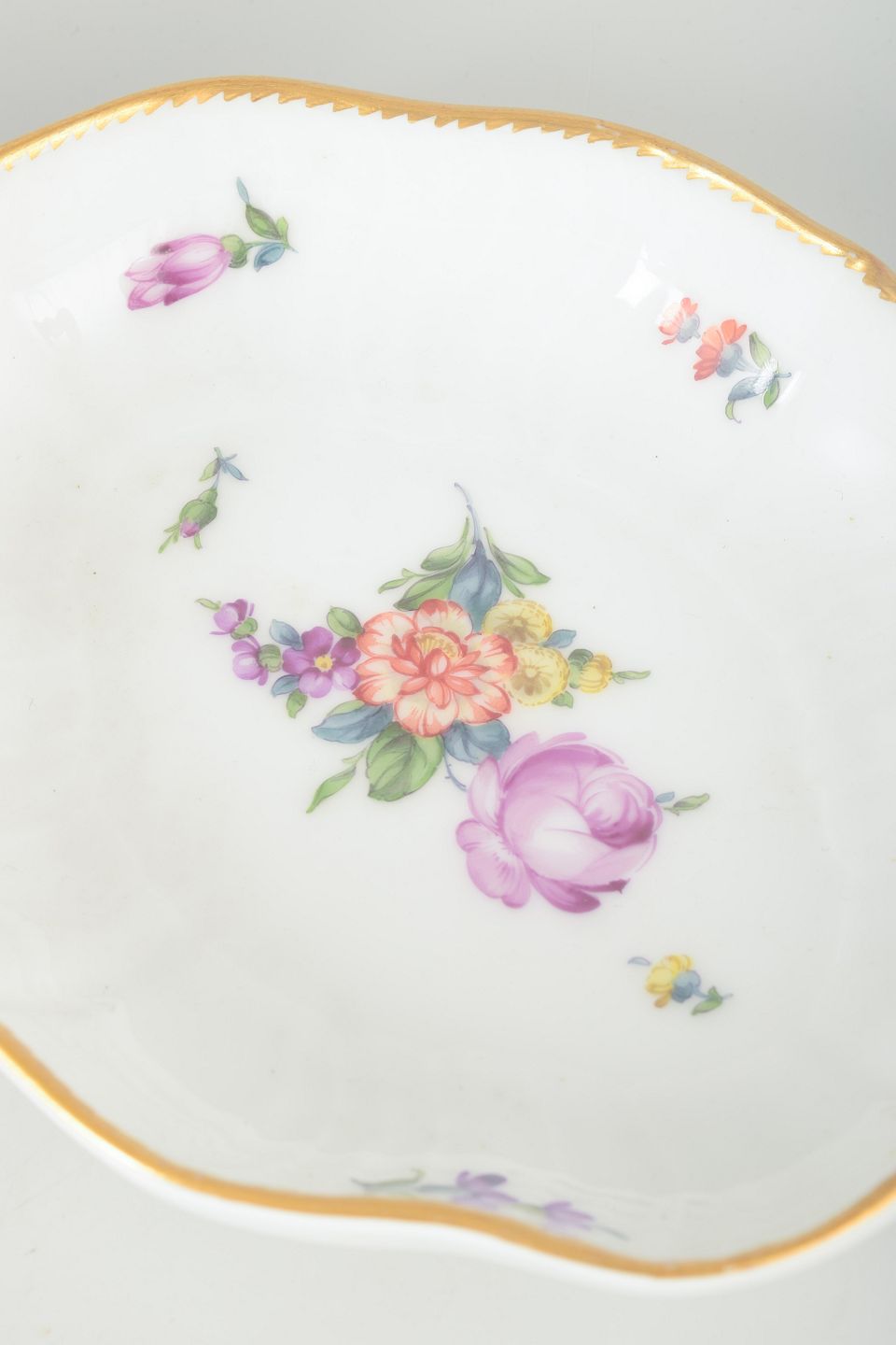 Porcelænssæt bestående af en lille balusterformet vase med håndmalet blomsterdekoration og guldkant samt et ovalt kagefad dekoreret i det klassiske “Sachsisk Blomst” mønster.