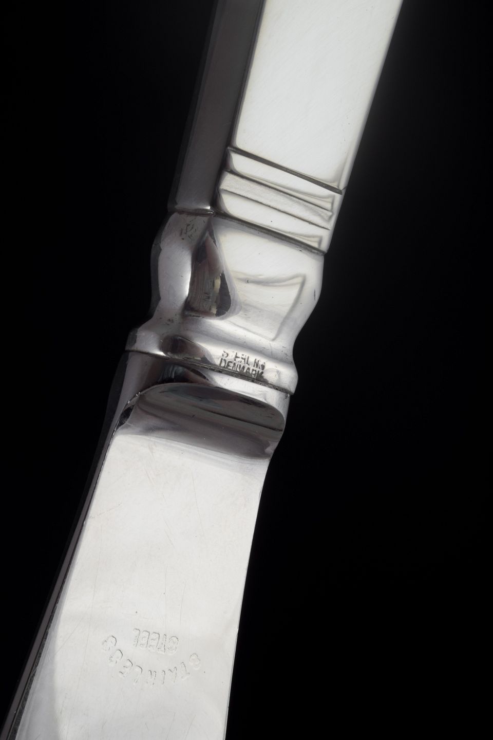 Sæt bestående af 4 middagsknive i det elegante “Blok / Acadia”-mønster, designet af Harald Nielsen i 1918. Knivene har sterlingsølvskafter kombineret med lange klinger i rustfrit stål. Designet er et klassisk eksempel på Art Deco-stilen med funktionalistiske linjer og geometriske proportioner.