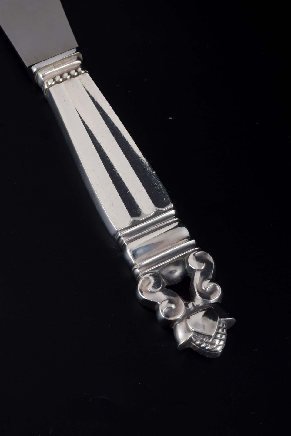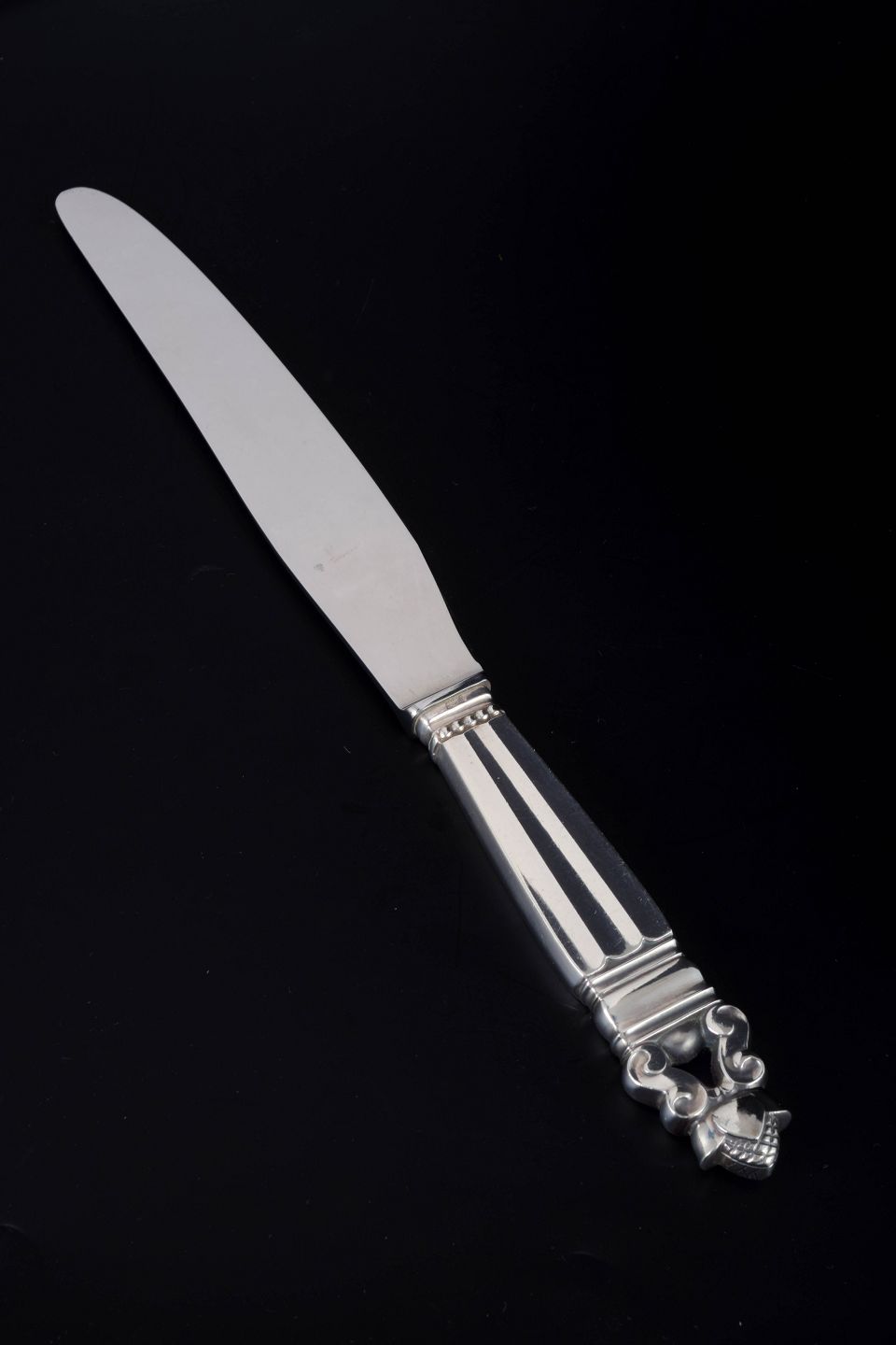 Elegant lang middagskniv i det klassiske “Konge / Acorn”-mønster, designet af Johan Rohde i 1915. Skaftet er udført i sterling sølv, mens bladet er i rustfrit stål.