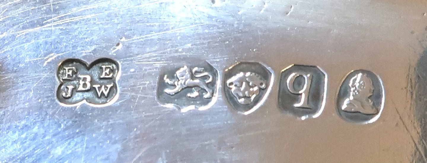 Englisches Sterling-Platmenage mit 7 Kristallkaraffen (925). Länge 19 cm. Höhe 20 cm. Hergestellt in London 1831.