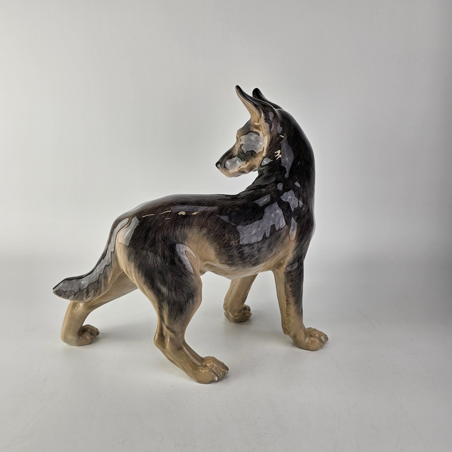 Figur i porcelæn med motiv af en stående schæferhund