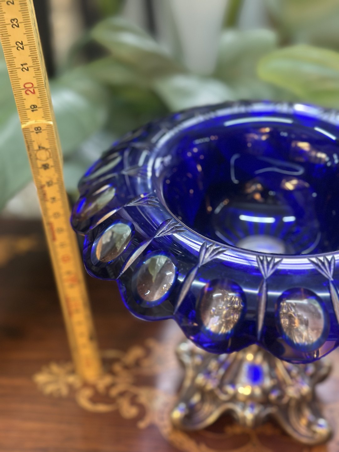 Böhmen Runde Schale mit gewelltem Rand und großer Öffnung auf einem verzierten Metallsockel im Barockstil. Versilbert mit verzierten Akanthusblättern und geschwungenen Füßen