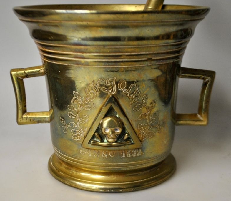 Großer Apothekermörser aus Messing von Svane Apoteket in Randers, 1882. Dänemark. Mit Stößel. Die Seite ist mit einem Dreieck verziert, in dem sich ein Totenkopf mit gekreuzten Knochen befindet. Mit eingraviertem Dekor und dem Namen: Skjold anno. 1882. Höhe: 15 cm. Durchmesser Öffnung: 17 cm. Länge Stößel: 25,5 cm.