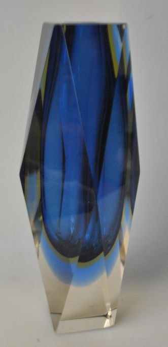 Venezianische Vase - Murano, 1960er Jahre. Italien. Sechseckige Vase. Klares, blaues und gelbes Glas. H.: 20,5 cm.