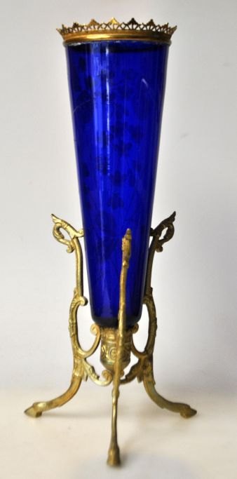 Antike kobaltblaue Vase mit Emailmalerei, Deutschland 19. Jahrhundert. Montiert auf Bronzeständer. H.: 28,5 cm.