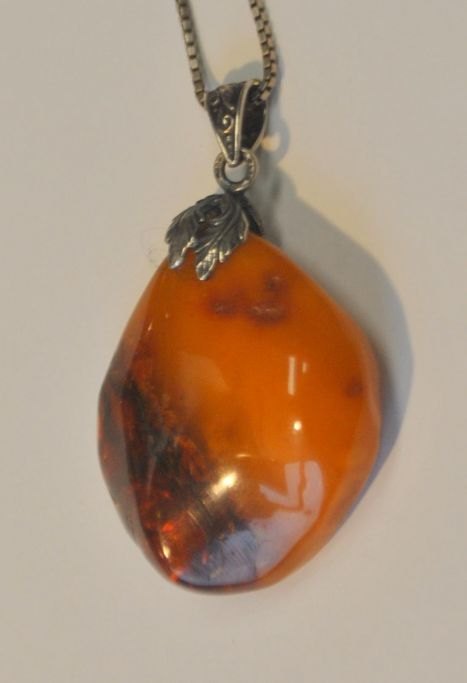 Bernsteinkette, N.E From, Nakskov (nach 1944), Dänemark. Polierter Bernstein. Sterlingsilberanhänger mit Blattwerk und Blumen. Sterlingkette, Länge: 42 cm. Von GIFA.