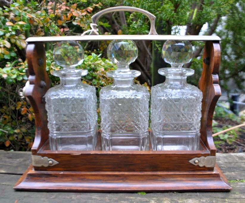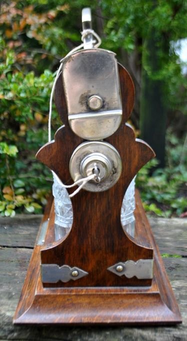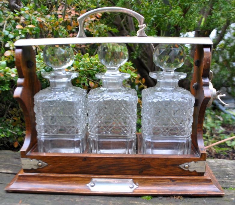 Tantalus aus Eiche mit drei Kristallkaraffen mit Stöpseln. England. 19. Jahrhundert.