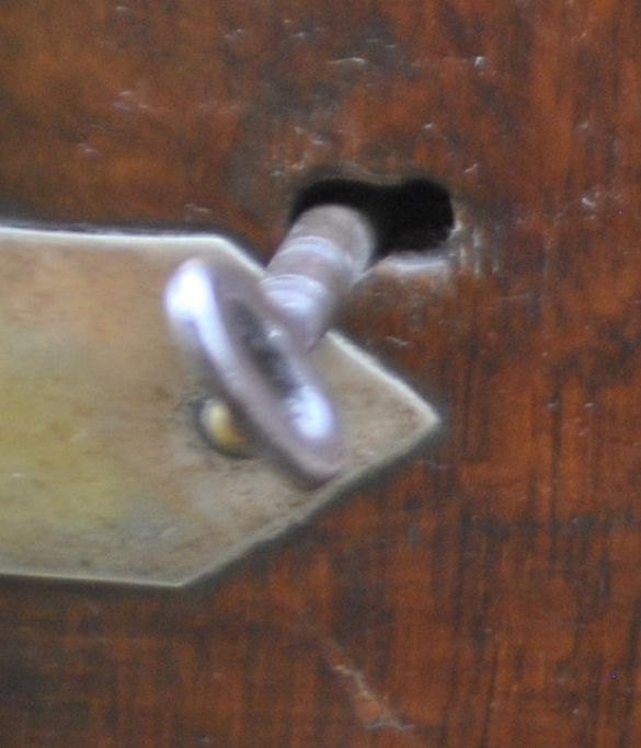 Tantalus aus Eichenholz mit zwei verschiedenen Kristallkaraffen mit Stöpseln. England. 19. Jahrhundert. Griff und Beschläge aus Messing. Seitliche Öffnung mit Schloss und Schlüssel. L: 26 cm. H: 32 cm.