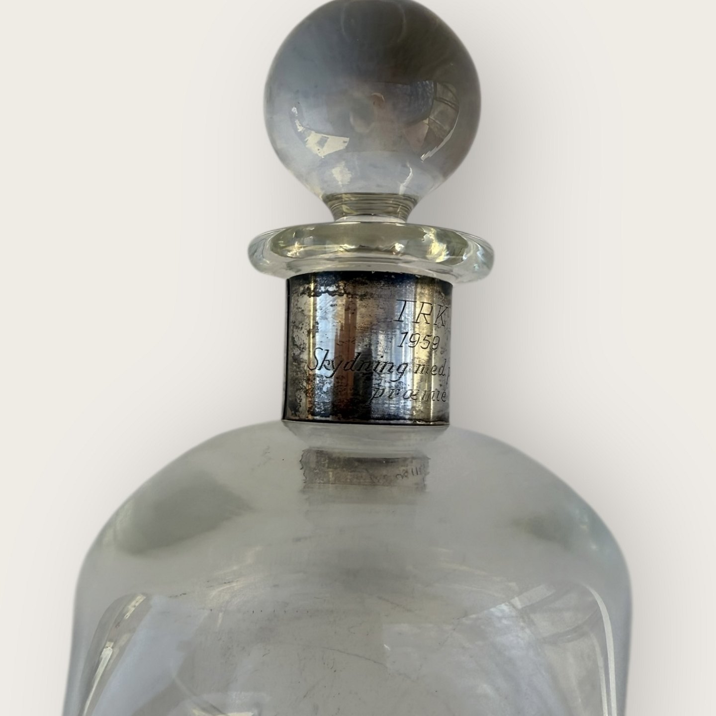 Große Klirrflasche mit Sterlingsilbermontierung von E. Dragsted, graviert: Preisschießen mit Pistole 1959, Höhe 32cm *guter Zustand*