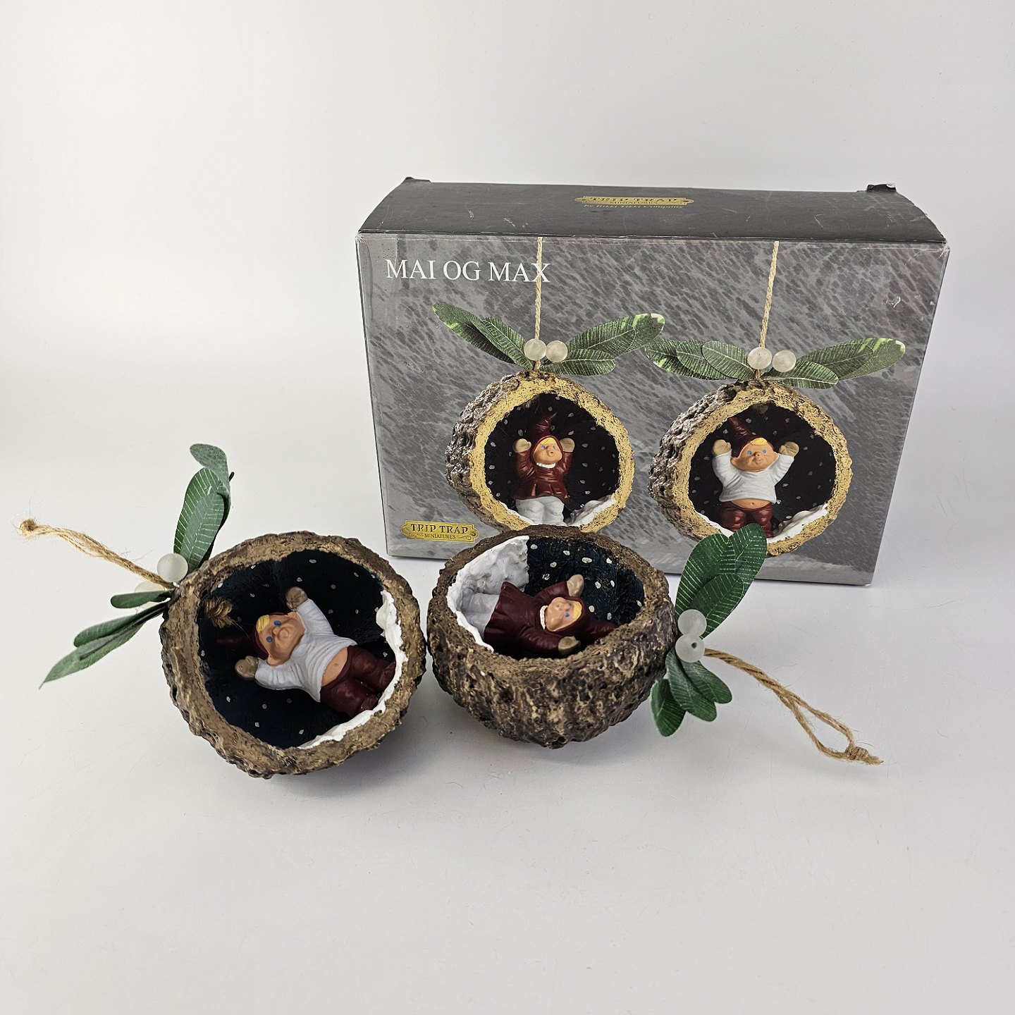 Figursæt til ophæng med motiv af nisserne Mai og Max i kokosnødder