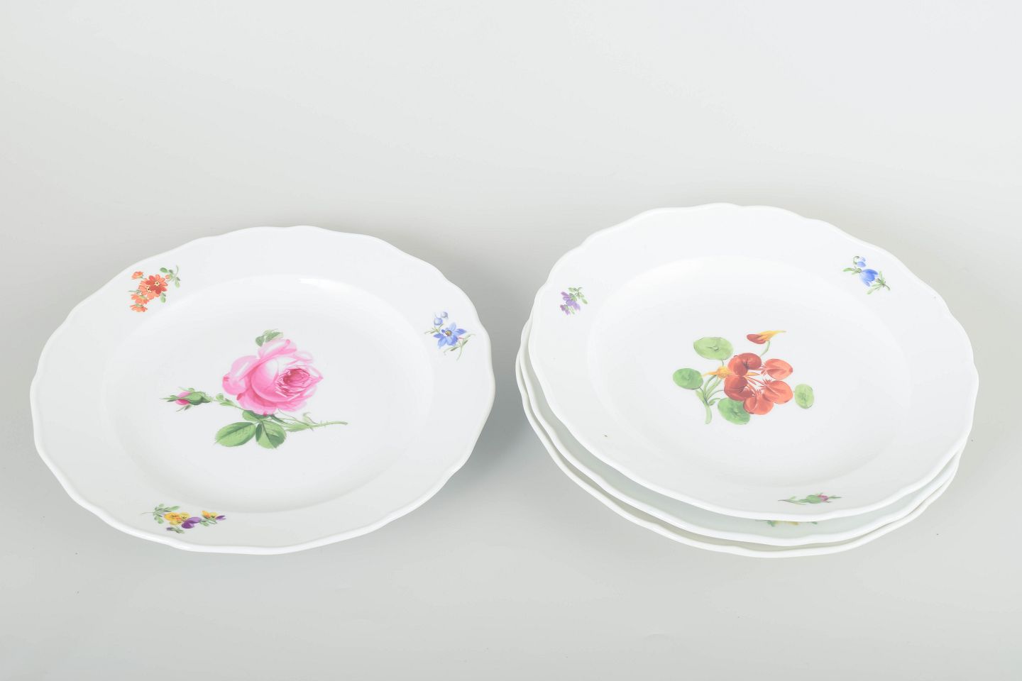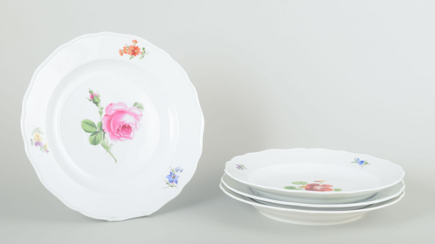 Fire tallerkener i porcelæn, håndmalede med blomsterdekorationer i flerfarvet palet. Klassisk bølget kantprofil med relief og delikat staffering.