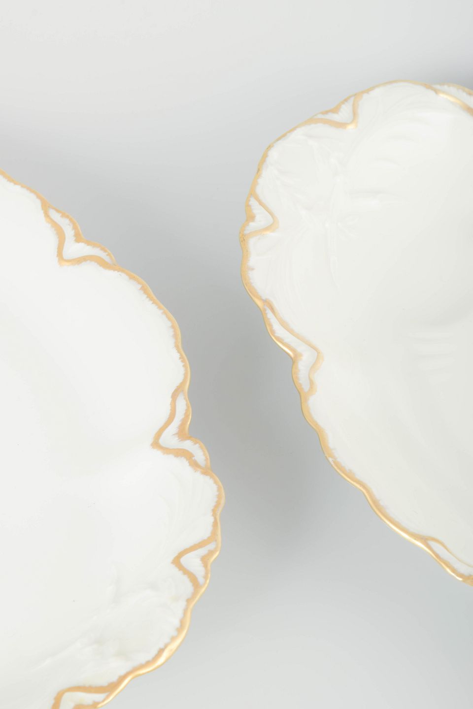 Elegant sæt ovale fade i cremefarvet porcelæn med håndmalet guldkant og svungne profilerede former. Klassisk fransk design i tidstypisk art deco-inspireret udtryk.