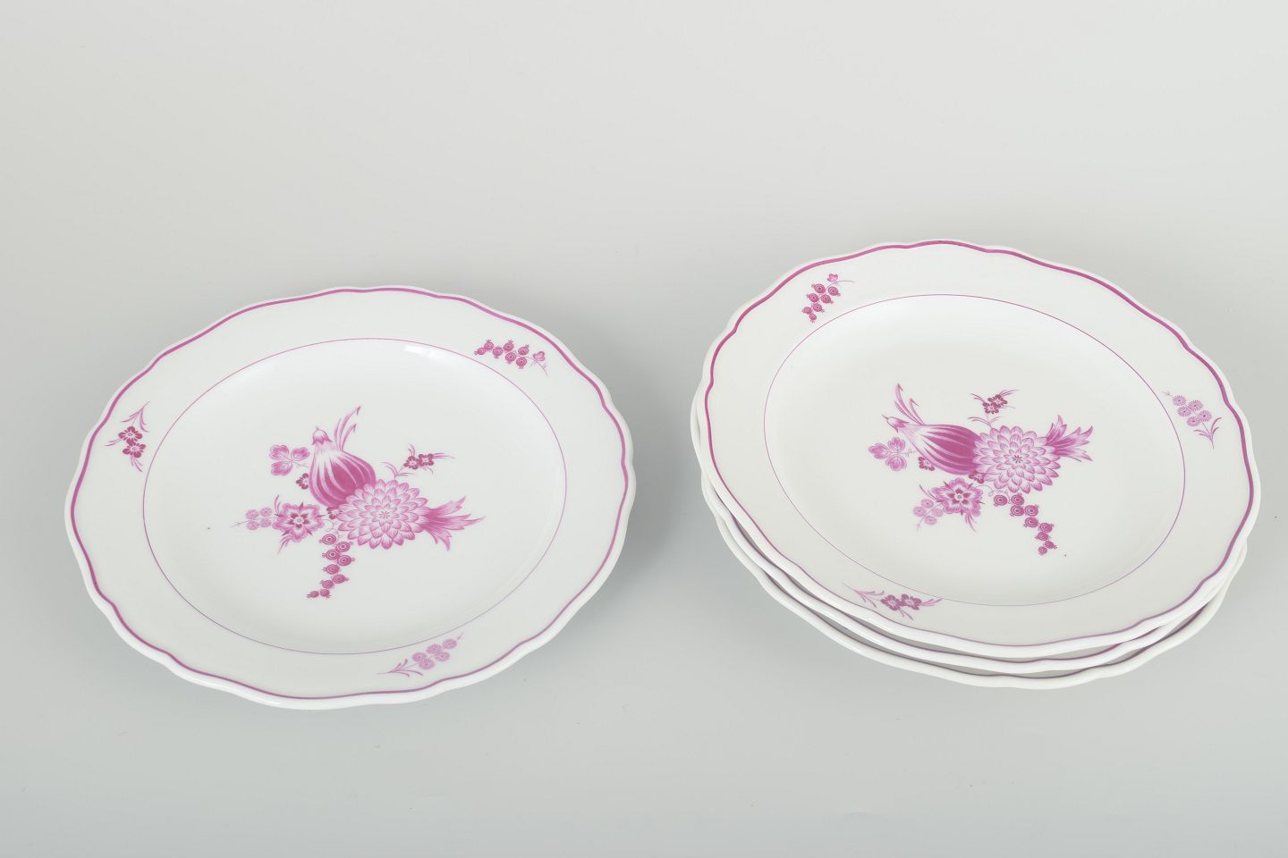 Sæt af fire håndmalede frokosttallerkener i porcelæn med dekor i lilla blomsterkompositioner og let bølget kant. Klassisk Meissen-design med elegant staffering i rosa toner.