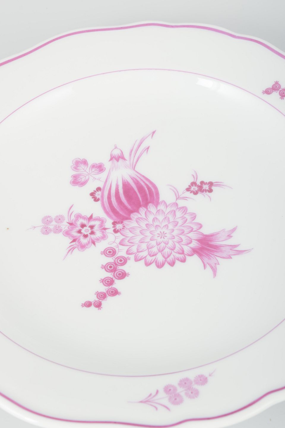 Meissen har siden begyndelsen af 1700-tallet været Europas førende porcelænsfabrik, kendt for sin håndmalede dekoration og tekniske perfektion. I 1930’erne blev de klassiske blomsterdekorer genfortolket i mere afdæmpede farver, som her i lilla, hvilket giver et elegant og tidstypisk udtryk.