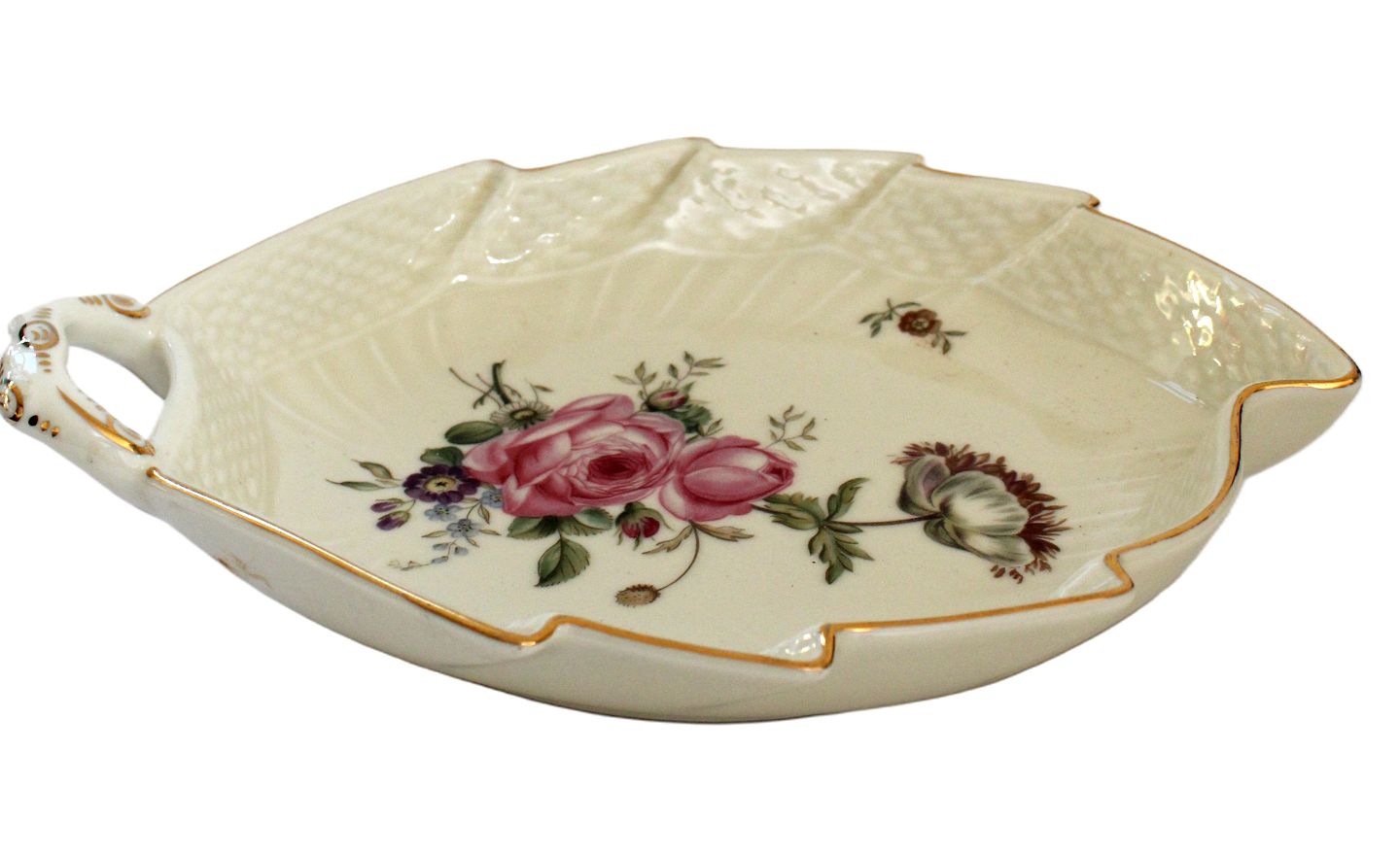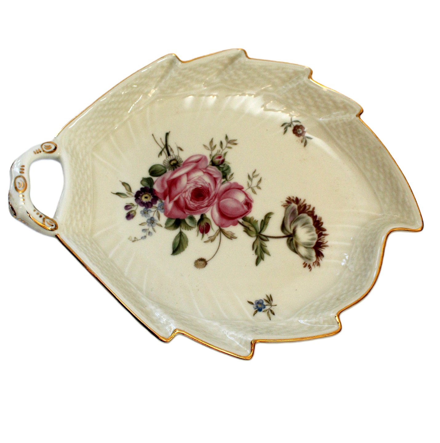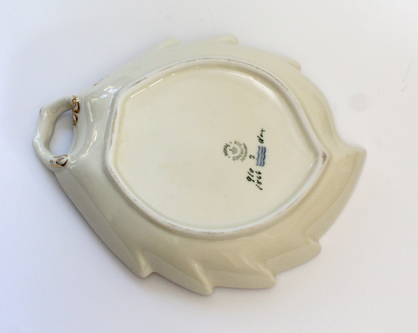 Text zugänglich auf Dänische: Royal Copenhagen, Frisenborg svejfet stel creme med forskellige blomstermotiver og guldkant. Nr. 910/1866. Længde 23 cm. Bredde 18 cm. I sortering. Pris: 125 kr. stk. Lager: 1