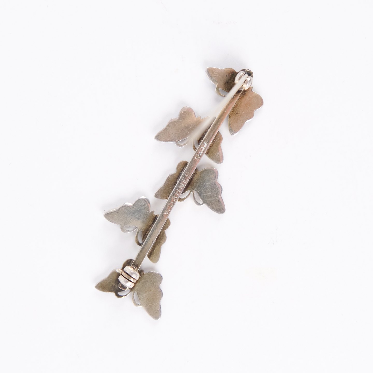 Brosche mit blauen emaillierten Schmetterlingsmotiven, gestempelt 925 S und gefertigt von Volmer Bahner & Co., Kopenhagen (1962–1987). Ein typisches dänisches Schmuckstück mit feiner Emaillearbeit und klarer Handschrift des bekannten Herstellers. Emaille vollständig intakt.