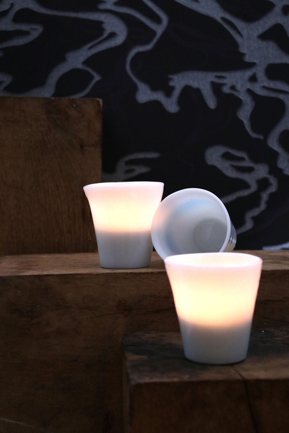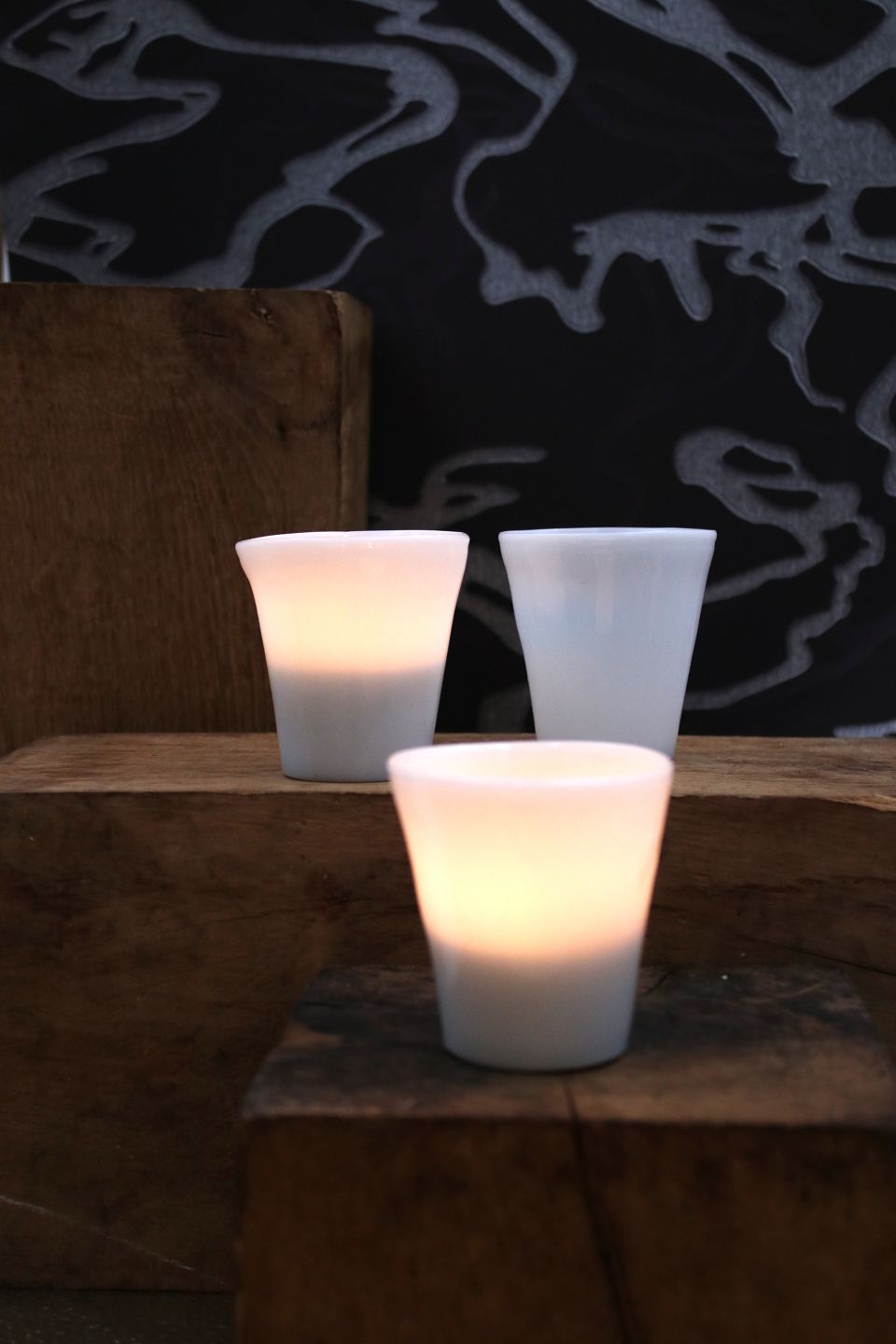 Gamle mundblæste lys glas i hvid opalglas til fyrfadslys.