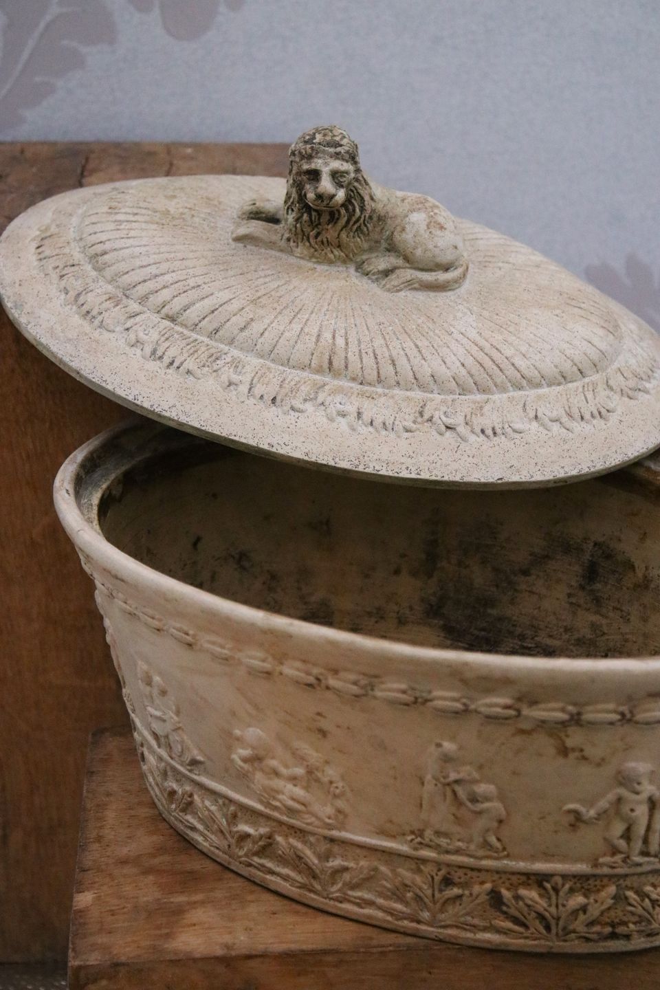Antik svensk oval empire fajance terrin fra 1810-40 med fine dekorationer og løve liggende på låget.