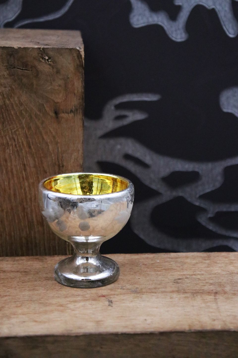 Antik 1800 tals lille skål på fod i fattigmandssølv / Mercury glass , med ætset dekorationer af bladranke på siden. ( Sølv udenpå , guld indeni )
