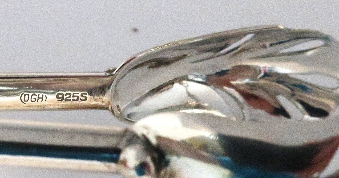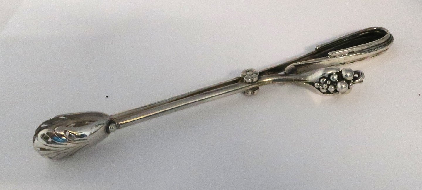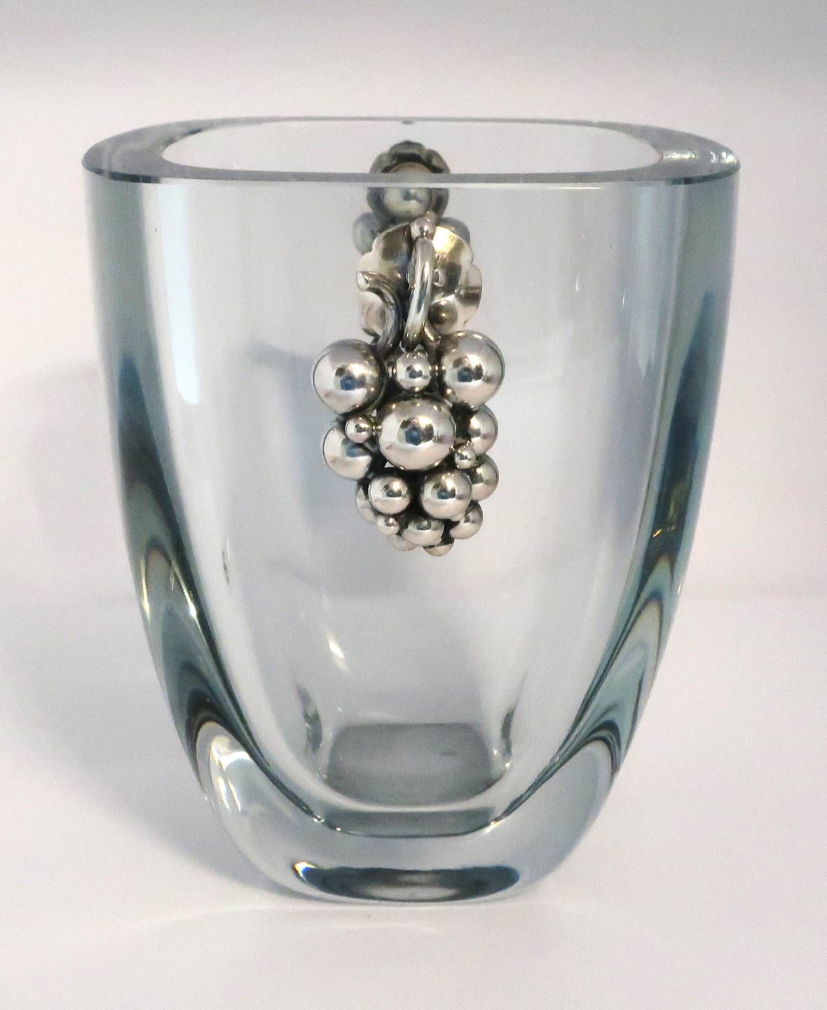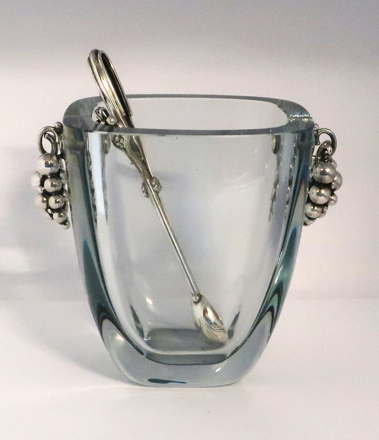 Dänisches Goldschmiedehandwerk (DGH). Holmegaard-Eiskübel mit Sterling-Griff in Form einer Weintraube. Höhe 15,5 cm. Breite 13 cm. Inklusive passender Eiszange aus Sterlingsilber.