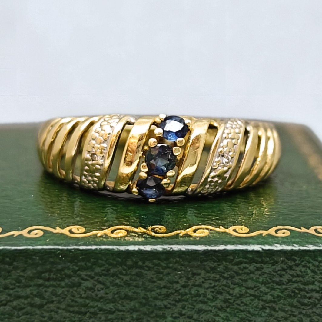 Text zugänglich auf Dänische: Ring i 14 kt. guld prydet med safirer og diamanter, der er fattet i hvidguld.