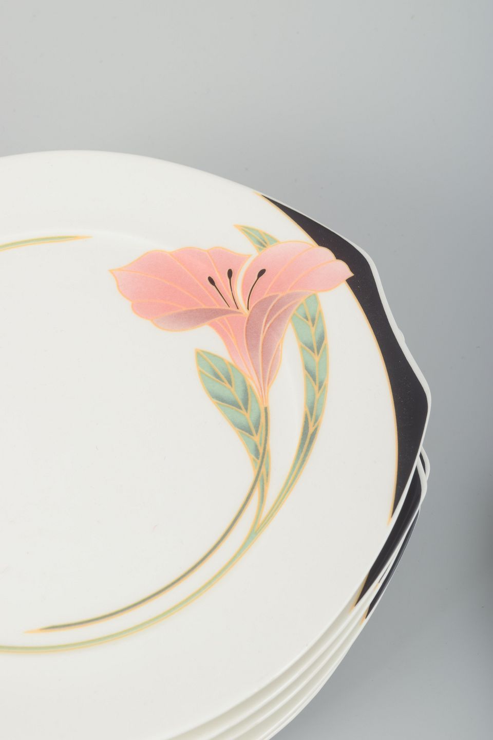 Seks porcelænstallerkener med håndmalet blomsterdekoration i rosa, grønne og sorte nuancer. Serien kombinerer bløde linjer og let asymmetriske detaljer med et elegant postmodernistisk formsprog.