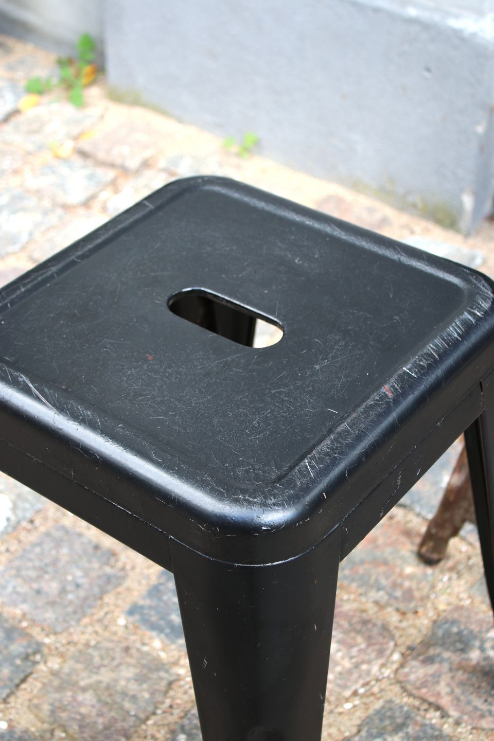 Original gammel fransk Tolix taburet i sortmalet metal med fin patina. H: 45cm. Top 31x31cm. Bund 40x40cm.