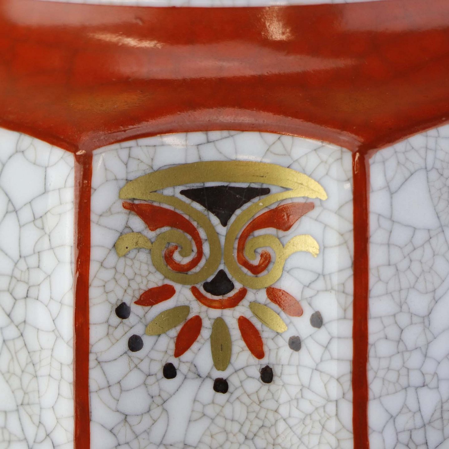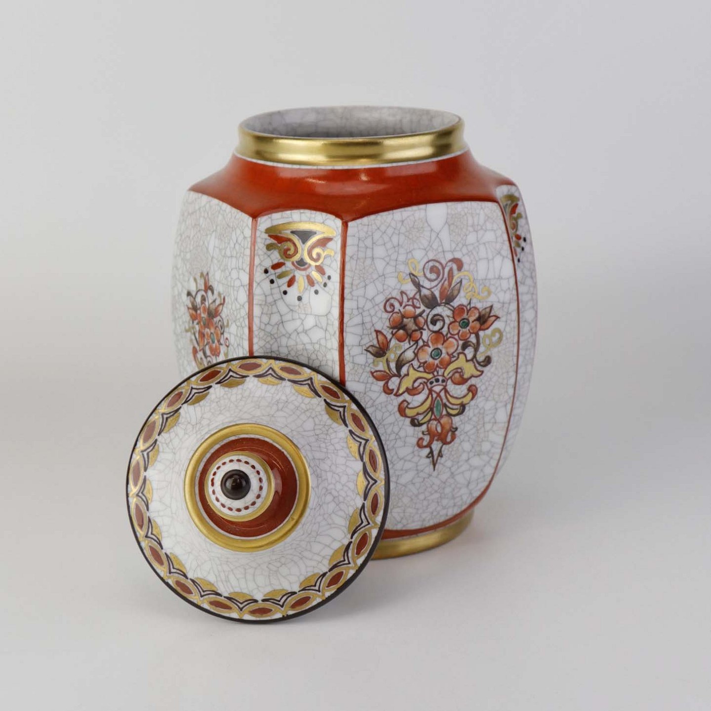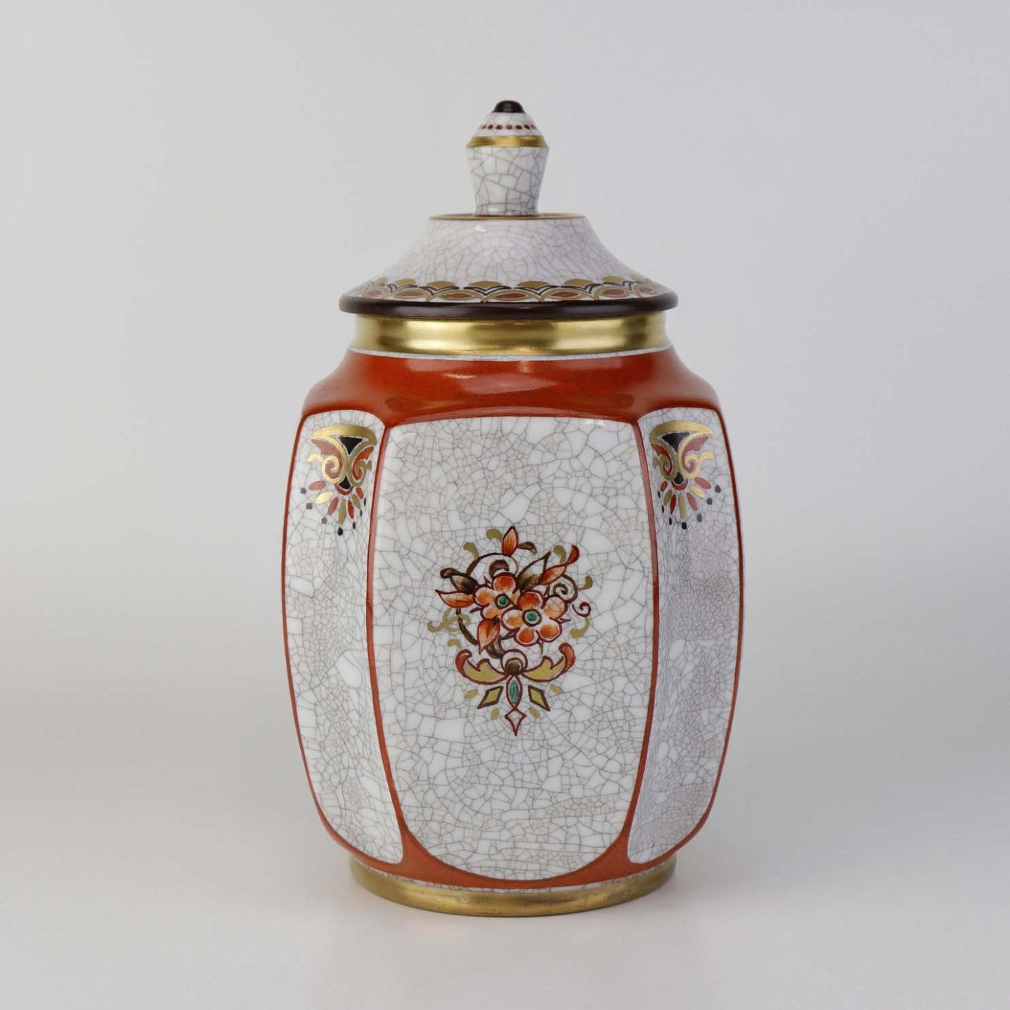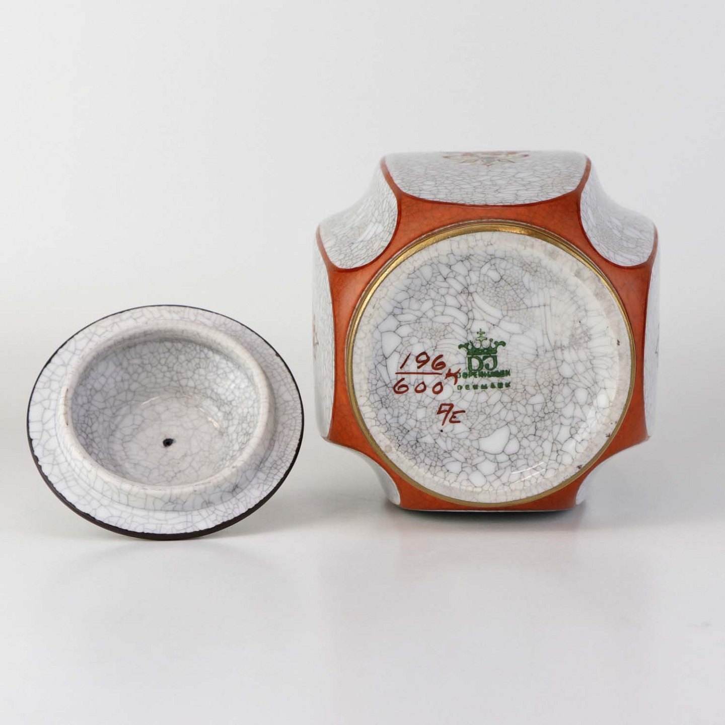 Text zugänglich auf Dänische: Kantet krukke med låg i porcelæn med krakele glasur og motiv af blomster samt kantet med orangerød bort og guld kant. Nr. 196/600